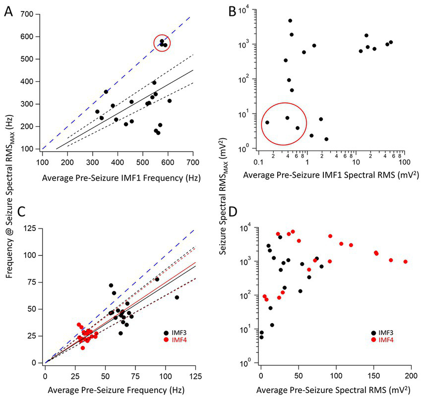 We were particularly interested in the IMFs that showed the largest changes in center frequencies and RMS values during seizures compared to the pre-seizure periods. For each IMF, we first identified the quintiles with the largest values of the power (RMS) during the seizure segment. We chose the center frequency of the same IMF during this same quintile to be compared to the average center frequencies of the same IMF during the pre-seizure period. Figure 2 shows the center frequencies (Figure 2A) and spectral RMS values (Figure 2B) for IMF1 (the IMF with the largest center frequency) plotted as the center frequency of the quintile with the largest spectral power during the seizure vs. the average center frequency during the pre-seizure period for all recorded seizures. A clustering analysis using farthest-point clustering algorithm set to identify two clusters classified the three values circled with red in the figure as an independent cluster. Interestingly, these values were all obtained from the first 3 seizures of animal I0001 and were excluded from the linear fitting of the data. A straight line through the origin fitted to the 12 remaining seizures indicates that the frequencies of IMF1s were reduced by average to 64% (the slope of the linear fit ± SD is: 0.64 ± 0.04) of the values compared to the center frequencies of the pre-seizure periods. The 95% confidence intervals (black dotted lines) show that the slope of this line is significantly different from the line with a slope of 1 (blue dotted line). Considering all 20 seizures, the pre-seizure average (± SD) IMF1 frequency was 491.5 ± 92.7 Hz while the average frequency at maximum RMS during the seizure was 319.3 ± 123.3 Hz. This difference is significantly different (two tailed p = 0.00003) as measured by a nonparametric Wilcoxon paired rank test. Similarly, as shown on Figure 2B, the pre-seizure spectral RMS average of IMF1s was 9.4 ± 11.6 mV2 vs. the average of the maximum spectral RMS values during the seizures of 774.5 ± 812.4 mV2, also significantly different (two tailed p = 0.0001) according to the nonparametric Wilcoxon paired rank test.