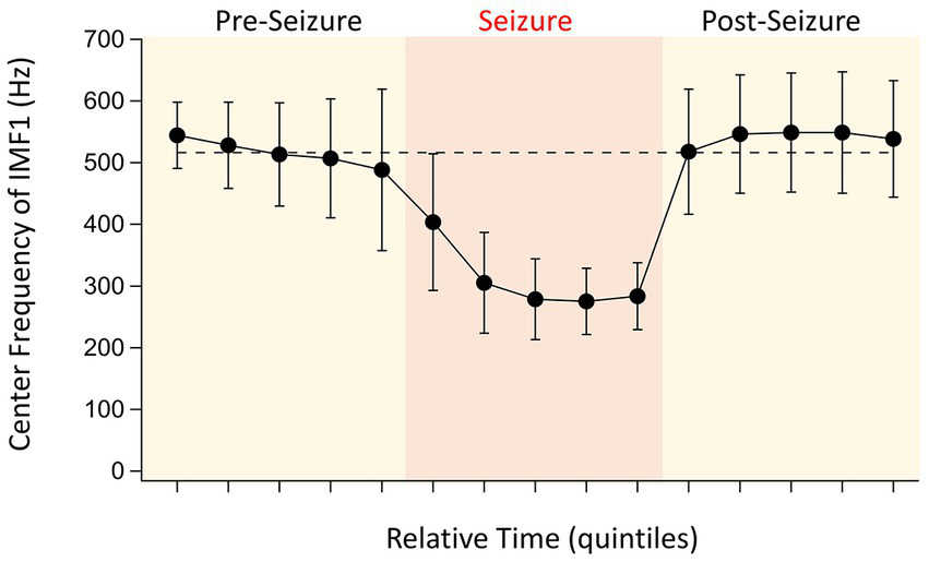 Evolution of IMF1 center frequencies during the pre-seizure, seizure, and post seizure periods. To have a relative comparison of the time courses for the various seizures recorded in different animals, the recordings were divided into five quintiles of time for each of the three periods that were of similar duration (see text for details). The points are the absolute values of the average center frequencies of IMF1s that were chosen based on their average center frequencies ≥400 Hz during the pre-seizure periods (n = 17 seizures, 8 animals). The error bars represent SD. Note the large decrease in center frequencies during the seizures, already starting at the end of the pre-seizure period, and the quick recovery of the center frequencies once the seizures are over.