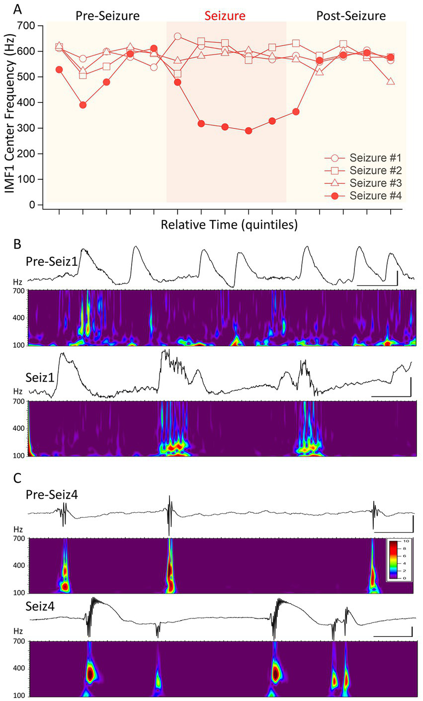 Distinguishing four seizures in the same animal based on the changes of IMF1 center frequencies during the seizures. (A) A plot similar to that in Figure 3, except for four consecutive seizures in mouse #I0001. The first three of these seizures were identified as a cluster apart from the rest (red circle in Figure 2A) and show no decrease in center frequencies during the seizures. The fourth (Seizure #4) shows the typical decrease in center frequency during the seizure. (B) Inter-ictal spikes (Pre-Seiz1) and ictal spiking (Seiz1) preceding and during Seizure #1. Below the raw traces the Morlet wavelet time-frequency analyses performed between 100 and 700 Hz (steps of 1 Hz) show the lack of pHFO in these recordings both before and during the seizures. The high-frequency oscillations present pre-ictally are also there in periods between the spikes and are most likely do to muscle contractions. The frequencies with the highest amplitudes found during ictal spiking have frequencies of <200 Hz. (C) The same as in (B), but for Seizure #4, which showed a significant decrease in center frequencies during the seizure. As shown by the Morlet wavelet analysis below the raw traces, both pre-ictal spikes, i.e., IIS (pre-Seiz4) and the ictal spiking (Seiz4) have very strong components in the 400 Hz range corresponding to pHFO. The color scale indicates the Z-score of the Morlet matrix and is the same scale for (B,C).