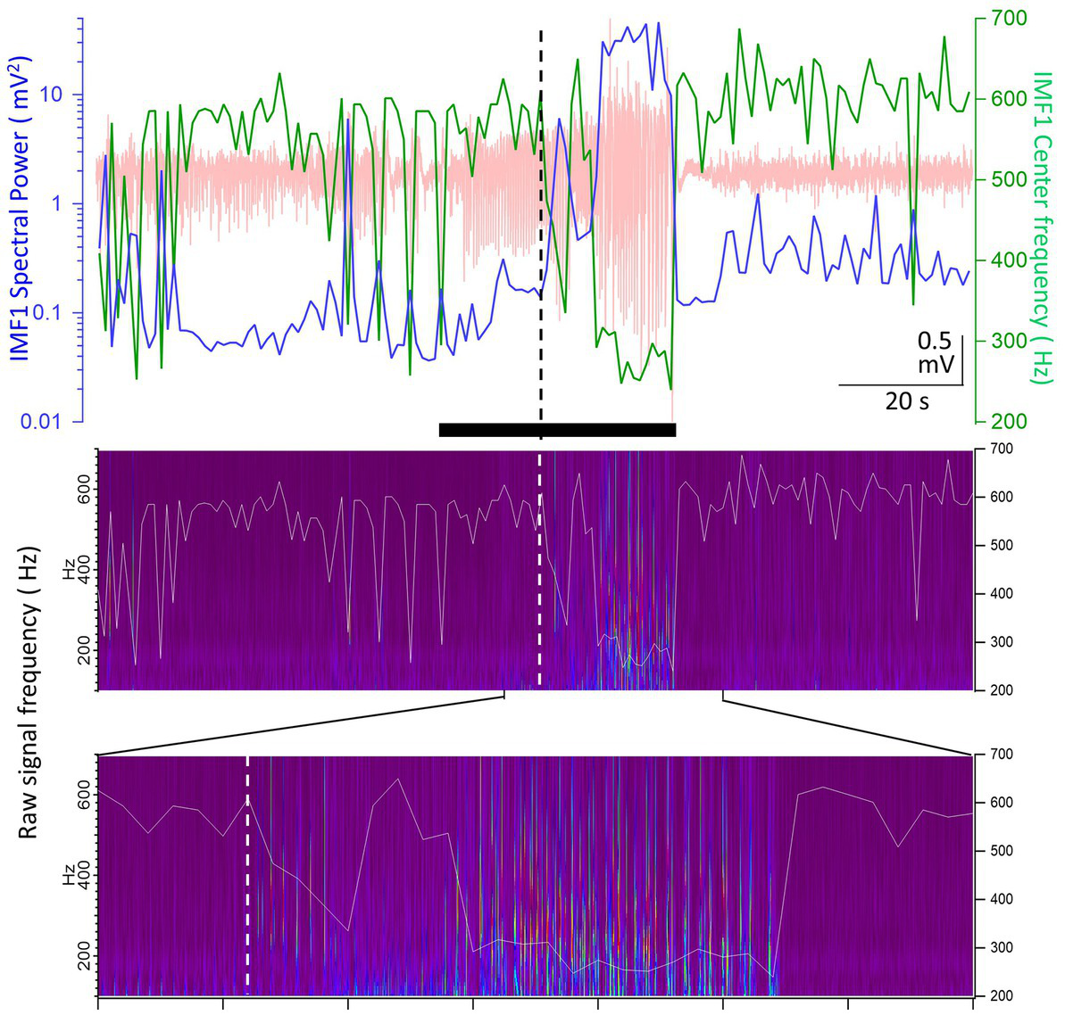 Example of a seizure recorded in animal #I0012 where the IMF1 frequency starts to decrease after seizure onset. Top panel: plot of the IMF1 spectral power (blue line, left y-axis) and center frequencies (green line, right y-axis) at 1 s resolution during the entire pre-seizure, seizure, and post-seizure periods (the raw record is indicated in pale red). The black bar below the trace shows the seizure duration as detected. The vertical dashed line shows the point where the center frequency of IMF1 starts to decrease during the seizure. Middle panel: the Morlet wavelet transform of the raw recording indicating frequencies between 100 and 700 Hz (left y-axis). Superimposed on the image is the trace of the center frequency of IMF1 (right y-axis). Bottom panel: expanded region as indicated by the marks, showing the time during the seizure when the frequency of the IMF1 begins to drop (dashed line). Please note that the pHFOs in the range of 200–500 Hz occur solely when the IMF1 frequency is diminished.