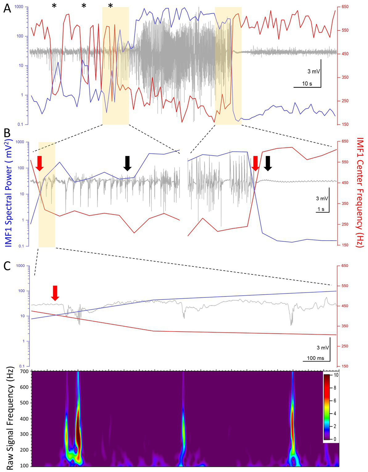 High temporal resolution analysis of the center frequencies and the spectral power (RMS) of IMF1 in the first seizure recorded in animal #I0009. (A) Plot of the IMF1 spectral power (blue line, left y-axis) and center frequencies (red line, right y-axis) at 1 s resolution during the entire pre-seizure, seizure, and post-seizure periods. Note that sudden decreases in center frequencies and commensurate increases in spectral power take place during the pre-ictal period (asterisks), but are not sufficiently long-lived to turn into seizures. These phenomena are also manifest at the beginning of the seizure, but last for the entire duration of the seizure, rapidly returning to pre seizure levels immediately after. (B) The regions of the recordings highlighted in yellow in (A) are shown at a faster time scale. The black arrows indicate the beginning and the end of the seizure as determined by the seizure detection algorithm. The red arrows show the inflection points of the center frequencies and of the spectral power. These precede the black arrows by 6 s at the beginning of the seizure and by 1 s at the end of the seizure, respectively (please see text for details). (C) The region of the recording highlighted in yellow in (B) are shown at a faster time scale. The three spikes immediately after the center frequency and spectral power inflection points show characteristics of pHFO with frequencies in the 300–500 Hz range. The color scale indicates the Z-score of the Morlet matrix.