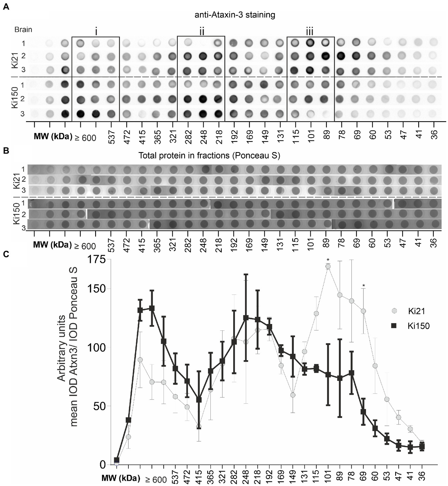 Proteins depleted in Ki150 fractions 282–218 kDa positive for ataxin-3 protein compared to Ki21 control.