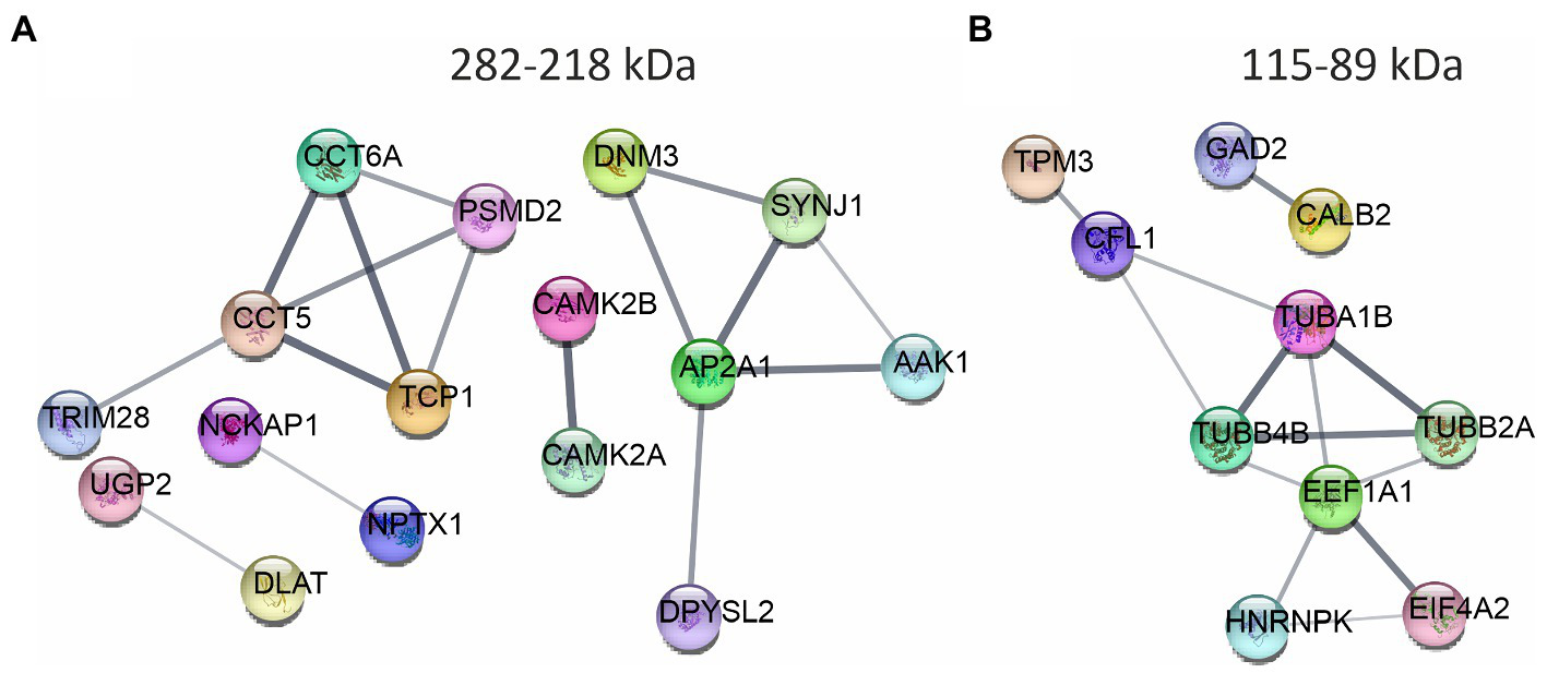 The networks of proteins composing complexes with ataxin-3 identified by ion exchange chromatography (IEC) and size using size exclusion chromatography (SEC) followed by LC–MS/MS. The networks were generated using String database and clustering (STRING Network p < 10e-16) (https://string-db.org/). (A) The fraction 282–218 kDa contains highly downregulated Camk2a, CamK2b, proteins belonging to Chaperon Containing TCP1-complex, and proteins being part of the adaptor protein 2 complexes. (B) In the fraction 115–89 kDa proteins responsible for the translation initiation process: Hnrnpk and Eif4a2 were highly enriched in the Ki150 brains. Proteins characteristic for the GABAergic neurons Gad2, Calb2 and Pcp2 were also altered. N = 3.