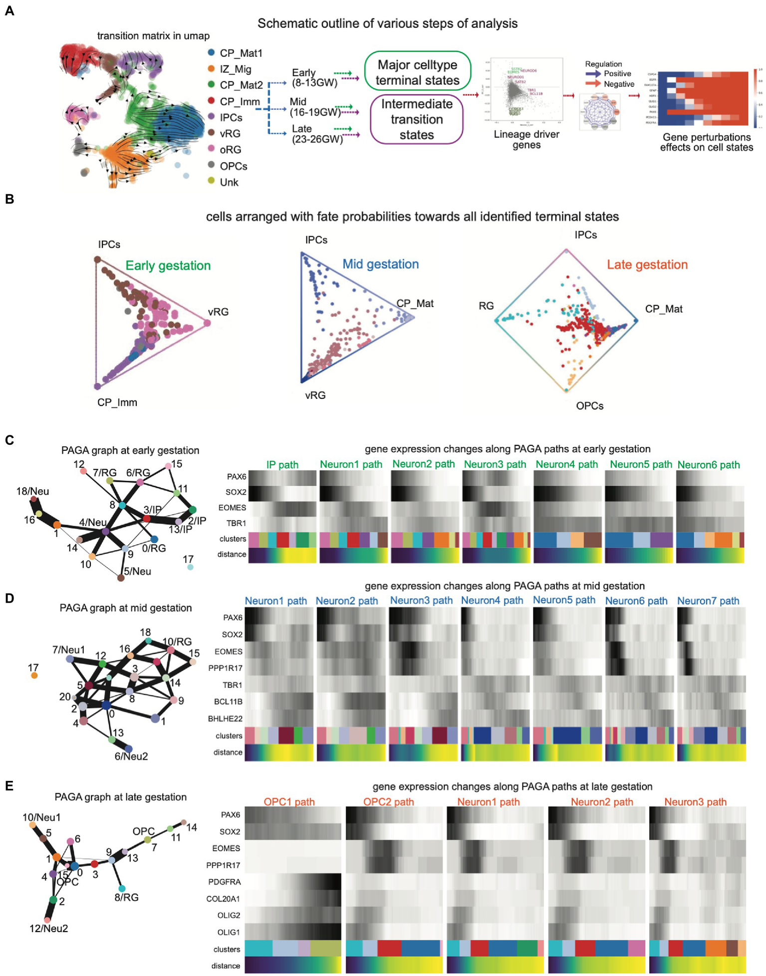(A) Schematic outline of various steps of analysis: The scRNAseq dataset was processed for QC analysis and cluster identification with known cell type markers. Developmental stages were separated into early (8–13 GW), mid- (16–19 GW), and late (23–26 GW) stages and then terminal fates and their intermediate states were analyzed using CellRank and PAGA, resulting in lineage-specific novel genes. Gene regulatory network (GRN) and perturbation analysis were performed using the iQcell platform; (B) Summarized fate probabilities toward all terminal states. In this representation, uncommitted progenitors and immature cells can be seen near the center and committed cells are placed near one edge; (C–E) PAGA graphs show cell clusters in which only terminal major cell states are named while the rest of the cells are arranged in a graph connected with weighted edges for their nature. The PAGA graphs capture the proximity of progenitors and strong connections within neuronal clusters and then glial clusters; (C) PAGA graphs (left) and gene changes along PAGA paths (right) at early embryonic brain development; (D) PAGA graphs (left) and gene changes along PAGA paths (right) at mid-stage embryonic brain development; (E) PAGA graphs (left) and gene changes along PAGA paths (right) at late-stage embryonic brain development.