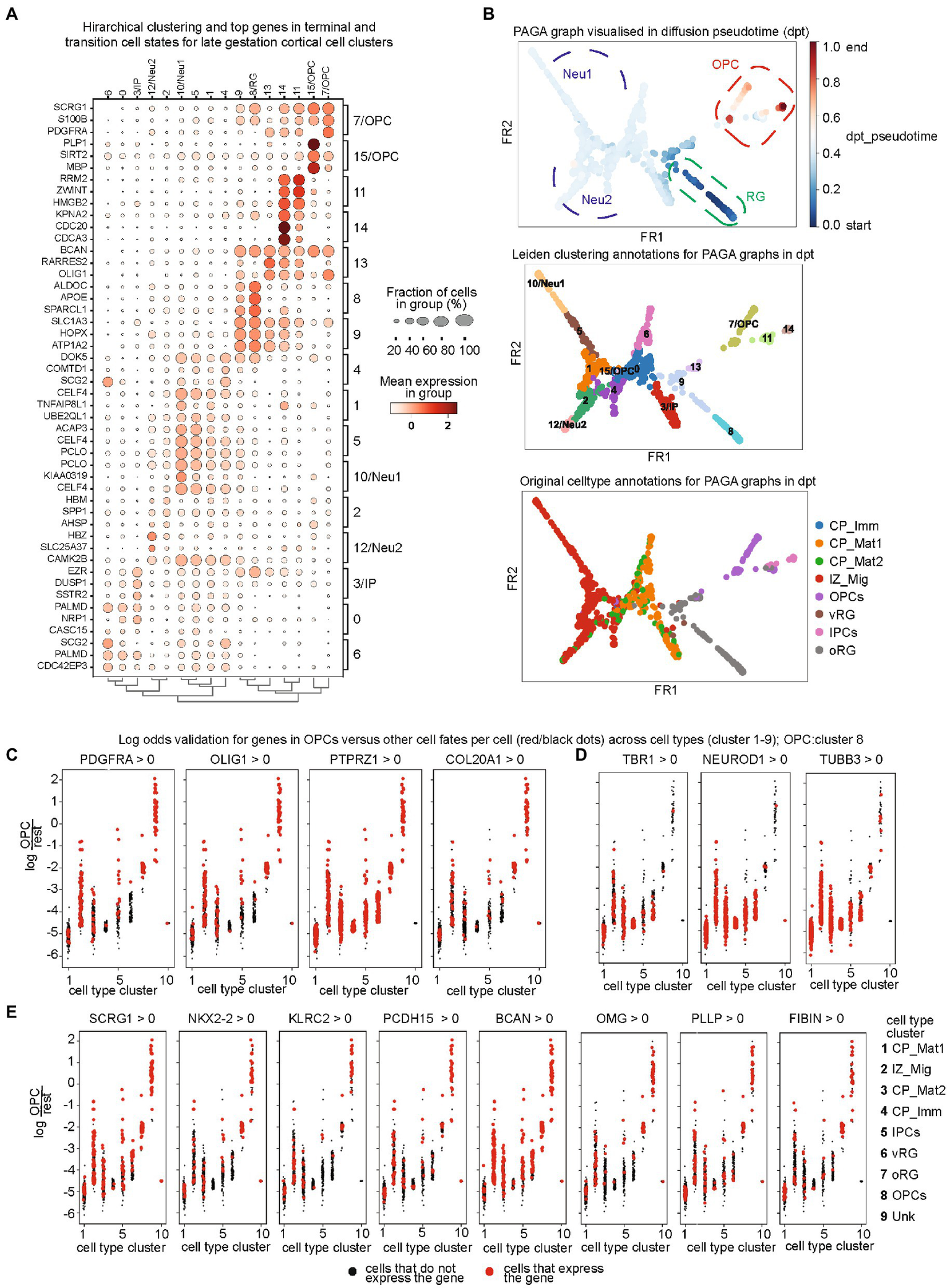 (A) Cellular state-specific top gene sets at late gestation time: Hierarchical clustering of identified PAGA clusters and their top genes in terminal and transition cell states for late gestation cortical cells. Fraction of cell numbers is represented in percentage (%), indicated by the circle size and mean expression intensity from low (white color) to high (red); (B) Diffusion pseudotime (dpt_pseudotime) plot for PAGA clusters (upper panel), which is then annotated into the PAGA cluster annotations (middle) and then the original cluster annotations from the initial dataset (bottom panel). All annotations show great alignment and confirm the accuracy of diffusion pseudotime. The dpt_pseudotime panel shows the radial glia lineage in dark blue, then neuronal in light blue, and later OPC lineage in red; (C–E) Validation of top lineage drivers by plotting the distribution of log odds for OPCs versus other cell fates per cell across cell types. Log-odds ratio confirmed the lineage specificity by comparison of OPC markers genes (C), neuronal genes (D), and the pre-OPC lineage genes.