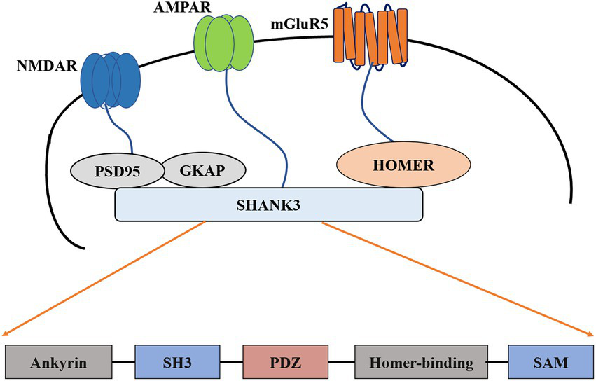 Shank (also known as ProSAP) protein has three main subtypes, Shank1, Shank2, and Shank3, with similar structural domains: N-terminal ankyrin repeats, an Src homology 3 (SH3) domain, a PSD-95/Discs large/ZO-1 (PDZ) domain, an extended proline-rich region, and a sterile alpha motif (SAM) domain (Saupe et al., 2011; Costales and Kolevzon, 2015; Varghese et al., 2017; Sgritta et al., 2019).