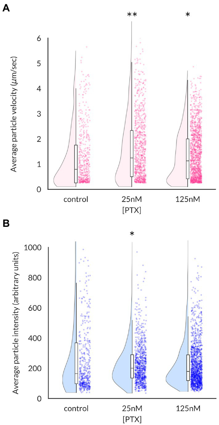Effects of paclitaxel on content and velocity of vesicles carrying NaV1.8 channels to distal axons. (A) Violin plots and box plots showing treatment of DRG neurons for 24 h with 25 nM or 125 nM PTX enhances the average velocity of NaV1.8-containing particles (**p = 6.3 × 10−8 and *p = 4.5 × 10−6 by Mann–Whitney U test with Bonferroni correction, respectively). Each point indicates the average velocity of a particle over the 40s imaging epoch; at least 3 independent DRG cultures were assayed for each condition. (B) Median vesicular fluorescence intensity was significantly increased by PTX treatment of 25 nM (*p = 0.02 by corrected Mann–Whitney U test).