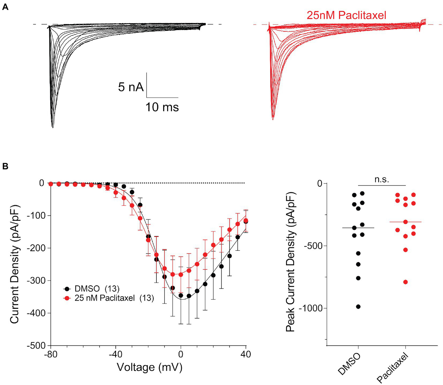 Paclitaxel does not affect density of current produced by endogenous NaV1.8 in the somas of DRG neurons. (A) Representative family of somatic NaV1.8 currents evoked by 100 ms depolarizing voltage steps from −80 to −40 in 10 mV increments from a holding potential of −80 mV. Traces from rat DRG neurons treated with DMSO control (black) and 25 nM PTX (red) conditions are displayed. Traces are shown only for current evoked during the test-pulse and do not show the response from the pre-pulse stimulus. (B) Left panel shows current density-voltage relationships of currents produced by endogenous somatic NaV1.8 channels in neonatal rat DRG neurons treated with DMSO (black; n = 13) or 25 nM PTX (red; n = 13). Data are presented as means ± SEM. Right panel shows distribution of peak current densities of cells. Means indicated by horizontal bars, no statistically significant differences were detected by Student’s t-test (p > 0.05).