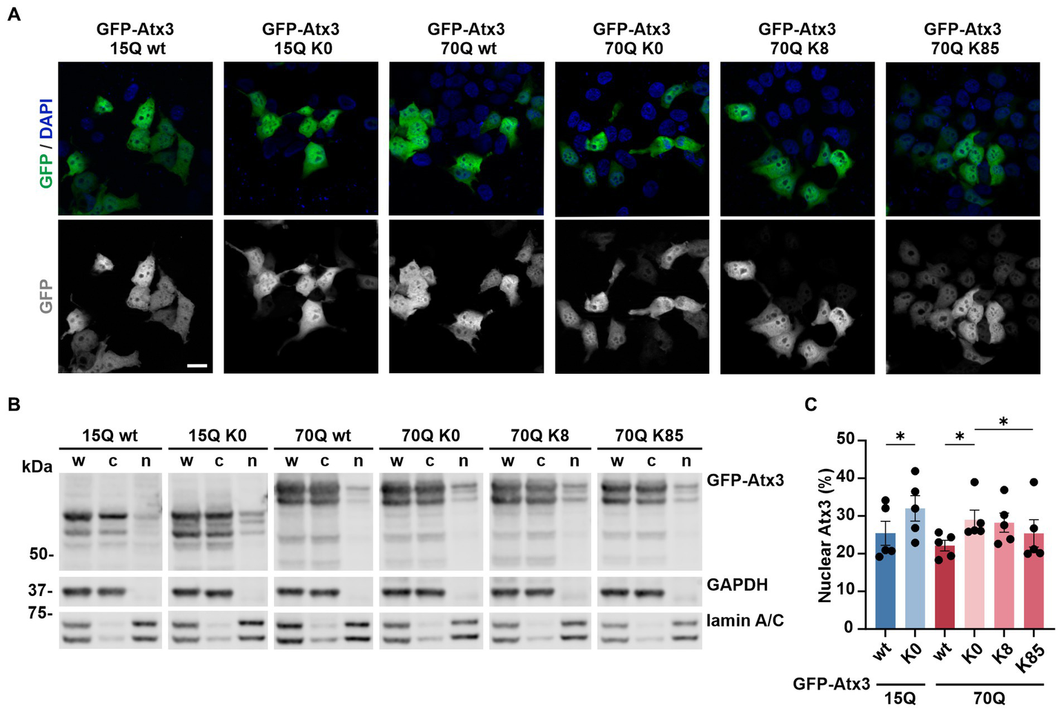 Lysine residues impact the intracellular distribution of ataxin-3. (A) Fluorescence microscopy analysis demonstrated a comparable intracellular distribution of the various GFP-Atx3 species, excepting for an apparently stronger nuclear localization of GFP-Atx3 15Q K0 and 70Q K0 in transfected 293 T ATXN3−/− cells. Scale bar = 20 μm. (B) Western blot analysis of a subcellular fractionation of 293 T ATXN3−/− cells overexpressing wild-type, lysine-free and single-lysine ataxin-3 constructs confirmed the trend of an enriched nuclear localization of soluble lysine-free ataxin-3 (15Q K0 and 70Q K0) and demonstrated a rescue of the subcellular distribution with the presence of K85. GAPDH and lamin A/C served as enrichment markers for the cytoplasmic and nuclear fractionation (respectively), and as loading controls. w, whole cell homogenate; c, cytoplasmic fraction; n, nuclear fraction. (C) Densitometric quantification of the nuclear fraction of ataxin-3 from the experiments represented in (B). Percentages were calculated relative to ataxin-3 in the respective whole cell extract, after normalization to the nuclear protein lamin A/C. n = 5, 15Q wt vs. 15Q K0, p = 0.02; 70Q wt vs. 70Q K0, p = 0.03; 70Q K0 vs. 70Q K85, p = 0.01 (*, paired t-test). Data is represented as means ± SEM. * p ≤ 0.05.