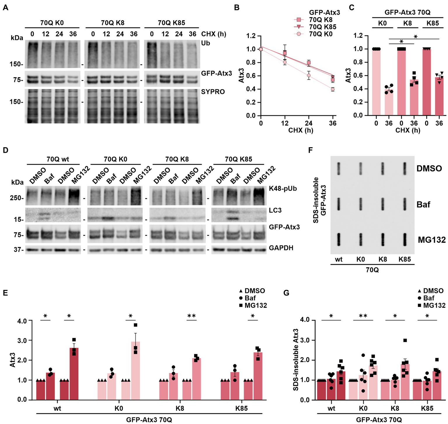 Stability of ataxin-3 is increased by the presence of lysine residues 8 and 85, and ataxin-3 turnover is largely depending on proteasomal degradation. (A) Time-dependent reduction of ubiquitin (Ub) chains and degradation of GFP-Atx3 in cells treated with cycloheximide (CHX) for assessing the degradation rate of the different ataxin-3 variants. SYPRO Ruby staining served as loading control. (B) Densitometric quantification of soluble ataxin-3 protein from (A), normalized to SYPRO and relative to the timepoint 0 h, demonstrated an increased stability of Atx3 70Q K8 and K85 in comparison to K0. n = 4, 70Q K0 vs. 70Q K8 and vs. 70Q K85, p = 0.009 (reject null hypothesis that one curve fits all datasets) (One phase decay). (C) Densitometric quantification of soluble ataxin-3 protein depicting the CHX chase assay’s endpoint (36 h). n = 4, 70Q K0 vs. 70Q K8, p = 0.03; vs. 70Q K85, p = 0.01 (*, one-way ANOVA with Tukey post-hoc test). (D) Western blot of lysates from cells overexpressing the ataxin-3 variants and incubated with either DMSO, autophagy inhibitor bafilomycin (Baf) or the proteasome inhibitor MG132 for 24 h prior to harvesting. Autophagy inhibition led to accumulation of LC3, and the proteasome inhibition resulted in increased K48-linked polyubiquitin chains (K48-pUb). GAPDH served as loading control. (E) Densitometric quantification of soluble ataxin-3, normalized to GAPDH and relative to the respective DMSO control. Significantly increased GFP-Atx3 70Q wt levels were observed upon inhibition of both degradation pathways, whereas a statistically significant accumulation of 70Q K0, 70Q K8 and 70Q K85 was only observed upon proteasome inhibition. n = 3, 70Q wt Baf vs. DMSO, p = 0.05; 70Q wt MG132 vs. DMSO, p = 0.02; 70Q K0 MG132 vs. DMSO, p = 0.05; 70Q K8 MG132 vs. DMSO, p = 0.004; 70Q K85 MG132 vs. DMSO, p = 0.01 (*, one-sample t-test). (F) Accumulation of ataxin-3 species due to the inhibition of degradation pathways had a direct impact on aggregate load, as demonstrated on the filter retardation analysis. (G) Densitometric quantification of SDS-insoluble ataxin-3 from (F) demonstrated its significant accumulation upon proteasome inhibition in comparison to DMSO control. n = 6, 70Q wt MG132 vs. DMSO, p = 0.05; 70Q K0 MG132 vs. DMSO, p = 0.005; 70Q K8 MG132 vs. DMSO, p = 0.03; 70Q K85 MG132 vs. DMSO, p = 0.03 (*, one-sample t-test). Data is represented as means ± SEM. * p ≤ 0.05, ** p ≤ 0.01.