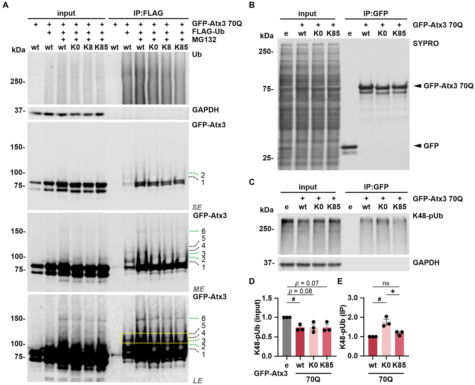Lysine 8 is potentially ubiquitinated and lysine 85 regulates the ataxin-3 binding to K48-linked polyubiquitin chains. (A) Ubiquitination analysis of ataxin-3 by immunoprecipitation (IP) of FLAG-tagged ubiquitin. GFP-Atx3 and FLAG-Ub constructs were overexpressed in 293 T ATXN3−/− cells, which were further treated with MG132 and subjected to FLAG tag-specific IP. Western blot analysis demonstrated that all GFP-Atx3 variants, including 70Q K0, were ubiquitin-positive, likely due to the presence of the GFP tag (green dashed lines 2, 3, and 6). Presence of specific, high-molecular weight ubiquitinated ataxin-3 was observed for 70Q wt (black dashed lines 1, 4, and 5), which was not the case for the 70Q K0 variant. Reintroduction of lysine residue K8 (70Q K8) restored one of the high molecular weight bands observed in 70Q wt (yellow box; black dashed line 4), suggestive of ubiquitination induced by the presence of K8. GAPDH served as loading and IP purity control. SE, short exposure; ME, medium exposure; LE, long exposure. n = 3. (B–E) Co-IP-based ataxin-3 interaction analysis. (B) Western blot of immunoprecipitated GFP empty (e) and different GFP-Atx3 70Q lysine variants from transfected 293 T ATXN3−/− cells. IP-based purification was confirmed via SYPRO Ruby staining. (C) Western blot of the IP probed for co-precipitated K48-pUb chains. GAPDH served as loading and purity control. (D,E) Densitometric quantification of K48-pUb chains from (C). (D) K48-pUb chains in the input were reduced upon the expression of Atx3 70Q wt in comparison to GFP empty, after normalization to GAPDH, whereas it showed a trend to reduction with Atx3 70Q K0 and 70Q K85. n = 3, one-sample t-test, empty (e) vs. 70Q wt, p = 0.03. (E) Immunoprecipitated GFP-Atx3 demonstrated increased binding to GFP-Atx3 70Q K0 in comparison to 70Q wt, after normalization to ataxin-3. Presence of lysine residue K85 (70Q K85) lowered the amount of bound K48-pUb chains back to 70Q wt levels. n = 3, one-sample t-test, 70Q wt vs. 70Q K0, p = 0.04; unpaired t-test. 70Q K0 vs. 70Q K85, p = 0.02. Data is represented as means ± SEM. *, #p ≤ 0.05.