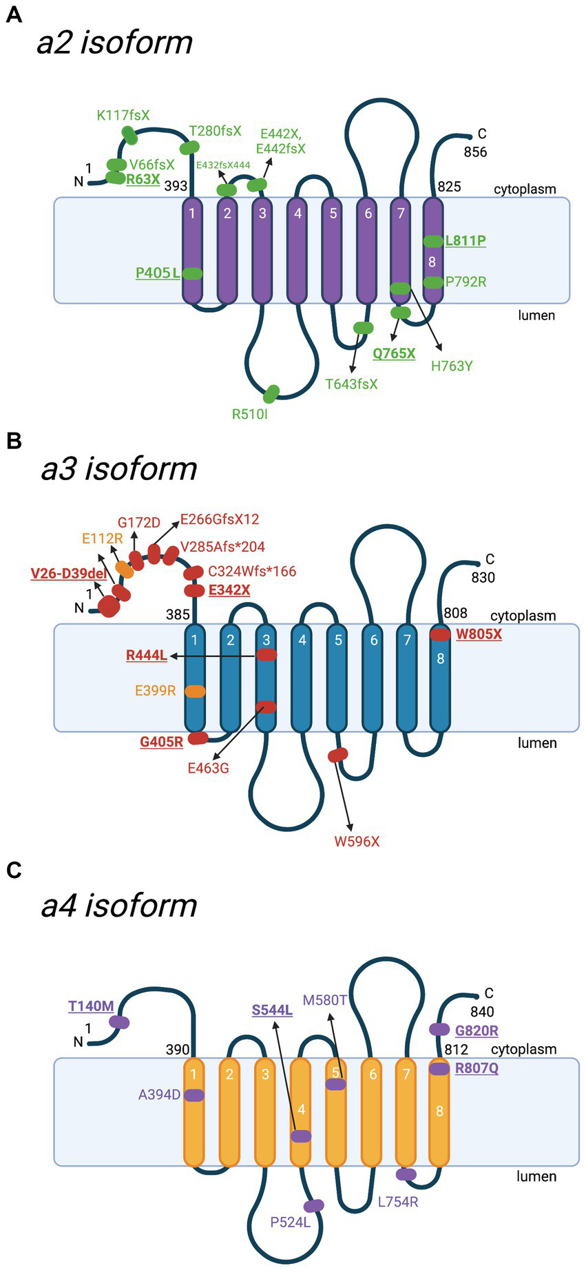 Schematic representation of a2-a4 subunits and location of mutations with the corresponding diseases. Besides a1, there are 3 other isoforms of V-ATPase subunit a. Various mutations have been reported in different diseases. Key mutations that are heavily discussed in the text are bolded and underlined. (A) Locations of various mutations to the a2 subunit, identified in cases of autosomal recessive cutis laxa type II (ARCL II). Amino acid sequences are based on Q9Y487 in UniProt. (B) Locations of identified mutations to the a3 subunit contributing to malignant infantile osteopetrosis (MIOP) (red) and its milder form (yellow). Amino acid sequences are based on Q13488 in UniProt. (C) Locations of mutations to the a4 subunit involved in distal renal tubular acidosis (dRTA). Amino acid sequences are based on Q9HBG4 in UniProt. For the purpose of annotation, transmembrane helices α7-α8 are not tilted. The figure was created with BioRender.com.