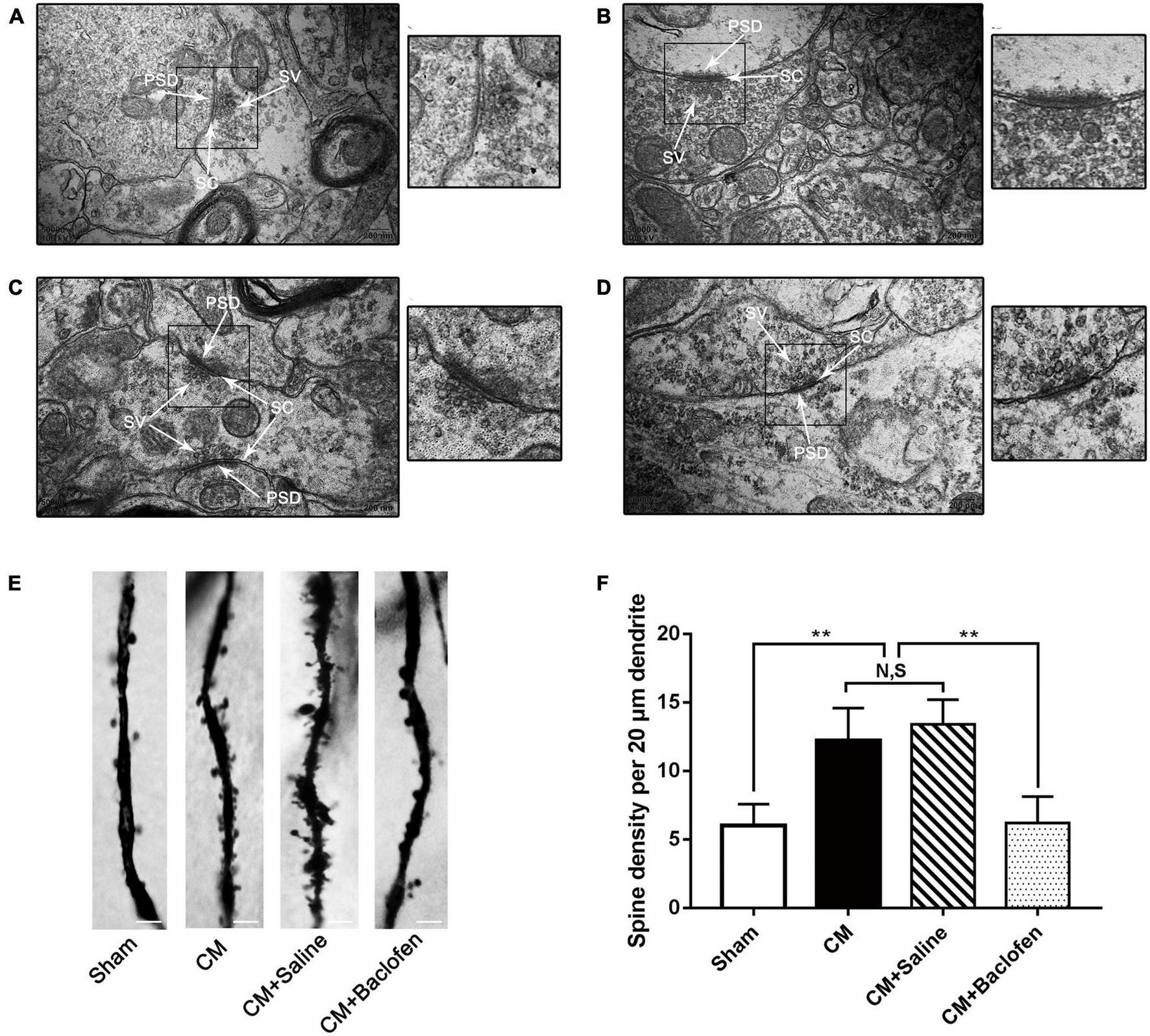 Changes in the synaptic ultrastructure and the density of dendritic spines in PAG neurons. (A–D) Synaptic ultrastructure in the four groups. A, a: Sham group; B, b: CM group; C, c: CM + Saline group; D, d: CM + baclofen group. PSD, postsynaptic density; SC, synaptic cleft; SV, synaptic vesicle. a–d show enlarged versions of the images in panels (A–D) (scale bars = 200 nm). (E) Representative photos of dendritic spines in the four groups. (F) Compared with the Sham group, the density of dendritic spines in the CM group was robustly elevated. GABABR activation by baclofen repressed the CM-induced increase of dendritic spine density, but there was no change between CM and CM + Saline groups (n = 6/group, **p < 0.01, N,S, not significant, scale bar = 5 μm).