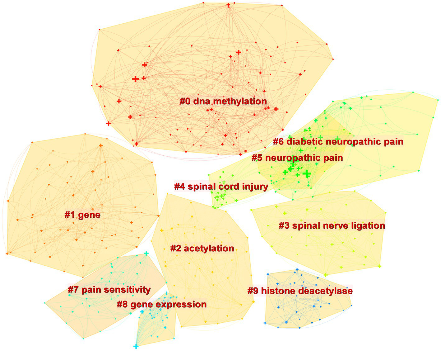 Figure 4 depicts the co-occurrence structure of keywords. The five major keywords that appear most frequently are “neuropathic pain” (n = 601), “expression” (n = 268), “spinal cord” (n = 152), “mechanism” (n = 128), and “activation” (n = 114). The modularity value (Q value) and the average silhouette value (S value) are two important parameters for evaluating the effectiveness of mapping (Figure 5). A Q value >0.3 and an S value >0.7 indicate significant clustering (Zheng et al., 2021). For the current study, the Q-value was 0.4331 and the S-value was 0.7293, indicating that these clusters were effective and exhibited good homogeneity. The front five clusters were #0 DNA methylation, #1 gene, #2 acetylation, #3 spinal nerve ligation, and #4 spinal cord injury. Figure 6 shows 35 keywords with a sudden increase in frequency and provides a basis for predicting the research focus of this field, which are analyzed in two dimensions: burst value and burst period. Its principle for measuring burst intensity and persistence is the algorithm for detecting frequency bursts suggested by Kleinberg (2002). The approach is based on modeling the stream by using an infinite-state automaton, in which bursts appear naturally as state transitions (Kleinberg, 2002). The top five keywords in terms of burst strength are “CPG binding protein 2” (9.13), “differential expression” (5.7), “microglia” (5.66), “primary sensory neuron” (5.47), and “persistent pain” (5.30). Based on the duration of the burst, the keywords with the longest outbreak duration were “gene,” followed by “inflammatory pain” and “histone deacetylase inhibitor.” “long non-coding RNA,” “microglia,” “inhibition,” “noncoding RNA” and “circular RNA” are keywords that continue to bursting until 2022, which shows that they are recent hotspots.