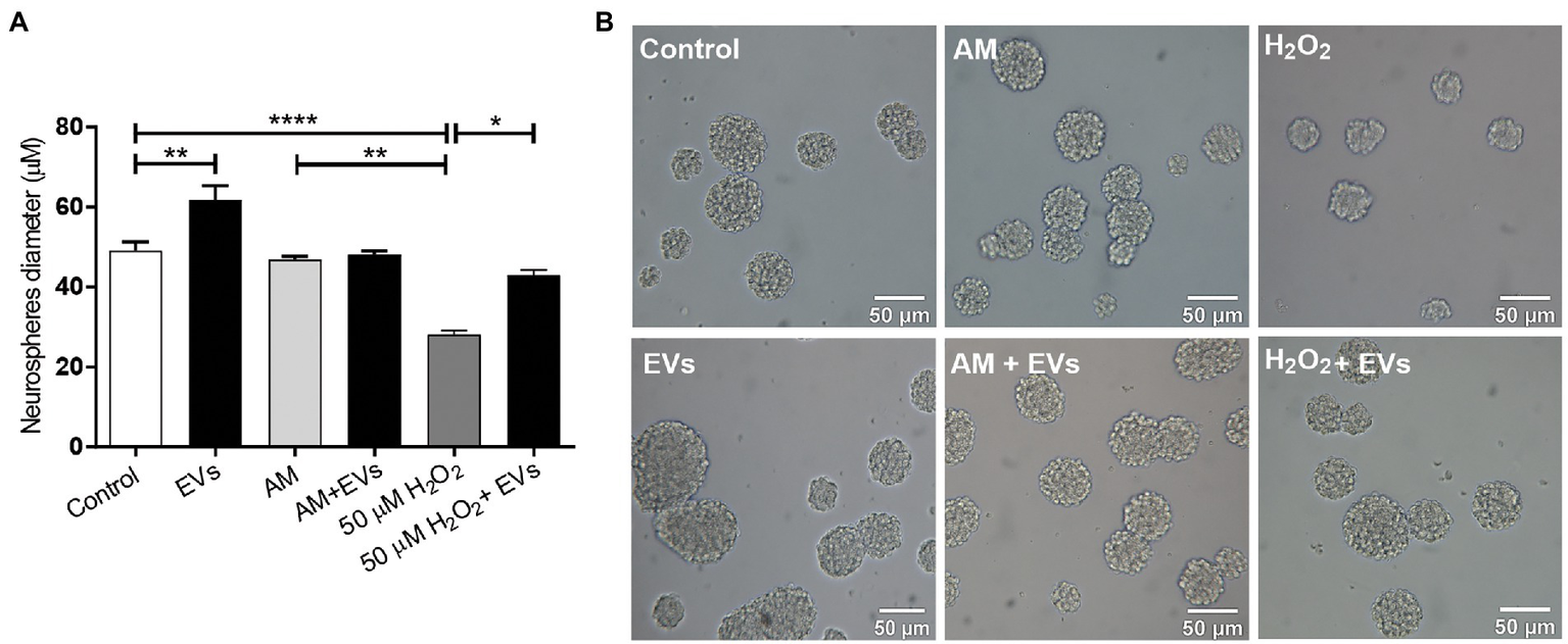 NSC-EVs regulate NSCs proliferation. (A) After incubating the NSCs under the indicated conditions (H2O2 50 μM; AM: activated inflammatory media) in the presence or in the absence of extracellular vesicles (NSC-EVs) during 96 h, proliferation was analysed by measuring neurosphere’s diameter. Graph represents the neurosphere’s diameter measured in three independent experiments. Data were presented as mean ± SEM. ****p < 0.0001; **p < 0.01; *p < 0.05. (B) Representative images (20X) of neurospheres incubated in the indicated conditions. Scale bars: 50 μm.