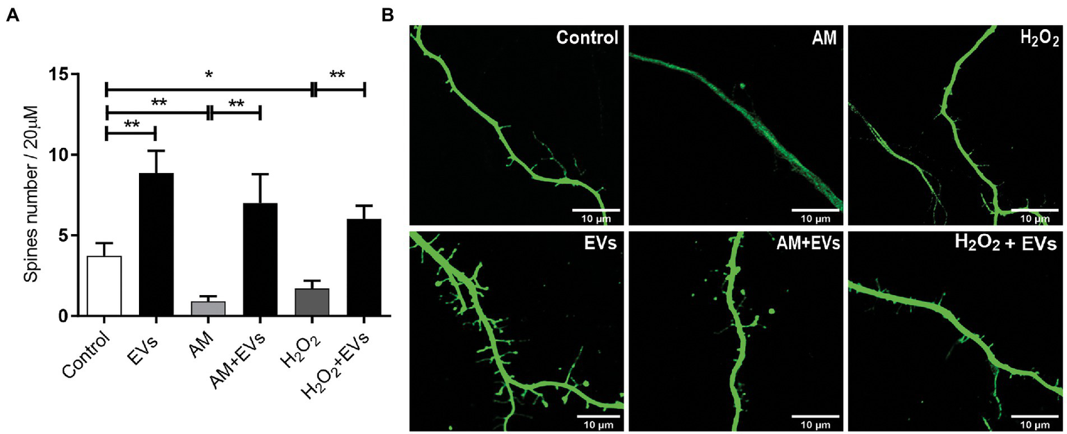 The burden of multiple conditions that give rise to acute or chronic inflammation is neuronal death (Aktas et al., 2007). Considering our results showing that NSC-EVs treatment improves neuronal differentiation and induces favourable morphological and functional changes under conditions that mimic a physiological state, we speculated that NSC-EVs could have a beneficial impact on neuronal differentiation under stress. We have previously demonstrated that incubation of NSCs during 72 h in AM affects neuronal differentiation, morphology and function. In fact, under inflammation, there is a clear increase in NSCs differentiation towards neuronal lineage, but the resulting neurons are aberrant (Magaquian et al., 2021). To evaluate the role of NSC-EVs under inflammation, we incubated NSCs with AM (20% V/V) (Magaquian et al., 2021) in the presence and in the absence of NSC-EVs. The analysis of βIII-tubulin expressing cells indicates that NSC-EVs treatment does not further increase the percentage of neurons but restores the aberrant phenotype observed under inflammation (Figures 3A,B, 6). Furthermore, a deeper analysis of functional parameters shows that NSC-EVs restore the number of Synaptophysin containing vesicles (Figures 4A,B), the levels of Synaptophysin and PDS-95 expression (Figure 4C) and the number of dendritic spines (Figure 5), suggesting that NSC-EVs could be used as a tool to stimulate tissue regeneration and neuronal plasticity. Similarly, we evaluated the effect of ROS species on differentiation and demonstrated that H2O2 induces the rate of neuronal differentiation (Figure 3A). Even though the morphology of the neurons look similar to that observed in the control (see Figures 3B, 6), a detailed analysis demonstrated that those neurons have reduced neurite length and less dendritic spines than the control, and that treatment with NSC-EVs restores the levels of both parameters (Figure 5; Supplementary Figure S3).
