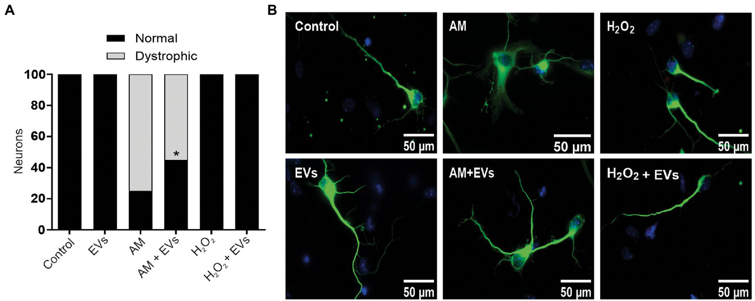 NSC-EVs restores morphology of dystrophic neurons. (A) Percentage of normal neurons (black bars) and dystrophic neurons (grey bars) after 3 days in culture medium under the indicated conditions. (Student’s T-test) *p < 0.05. (B) Representative images of neurons incubated under the indicated conditions (100X) Scale bars: 50 μm.