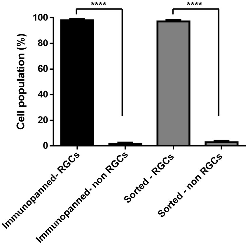 Percentage of living cells staining positive or negative for the RGC marker RBPMS for both immunopanning and IP-FACS sorted cells. The values were reported as the mean ± SD of three independent experiments: n = 3 in triplicates. Statistical significance RGCs versus non-RGCs (Student’s t-test): (****) p < 0.0001.