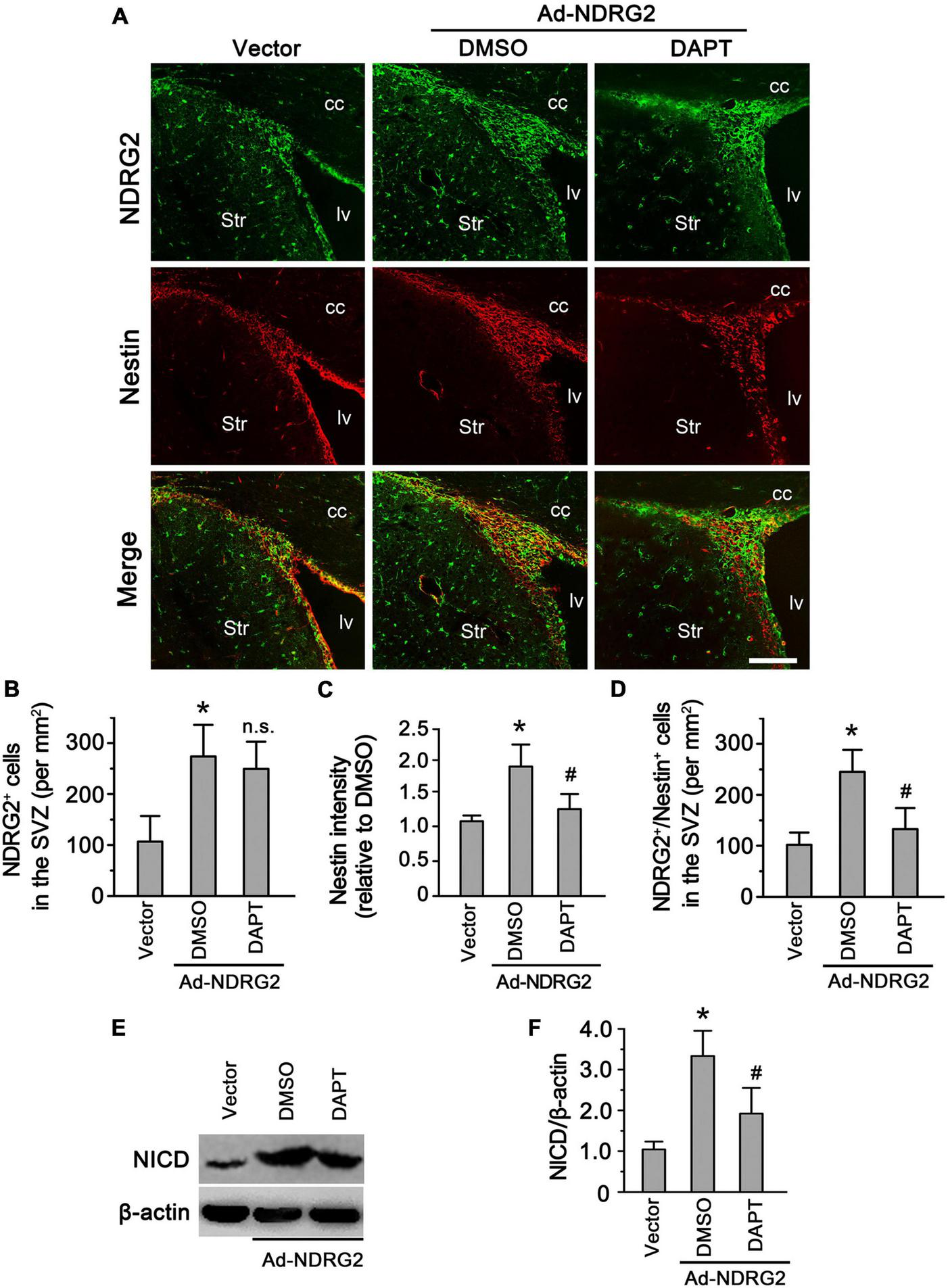 NDRG2 regulates endogenous NSCs in the SVZ via Notch signal. At the time when NDRG2-overexpressing adenoviruses were injected into the lateral ventricle, DAPT was administrated intracerebroventricularly into the contralateral ventricle. At 7 day following injection, double immunostaining of Nestin and NDRG2 was performed. (A–D) Compared with the blank vector control, NDRG2 overexpression significantly increased the immunoreactive signals of Nestin (C) and the number of Nestin+/NDRG2+ cells (D) in the SVZ. DAPT was able to mitigate these effects induced by NDRG2 overexpression compared with the DMSO control (C,D) but did not affect the number of NDRG2+ cells (n.s., no significance), (B). cc, corpus callosum; lv, lateral ventricle; Str, striatum. Scale bar in panel (A): 50 μm. (E,F) Under the normal condition, low levels of NICD were observed in the SVZ. Adenovirus-mediated NDRG2 overexpression significantly increased NICD expression of the SVZ and, however, DAPT attenuated NDRG2-induced NICD expression. Data are normalized to the DMSO control and shown as mean ± SEM (n = 5). *p < 0.05, vs. the blank vector control. #p < 0.05, vs. the DMSO control.