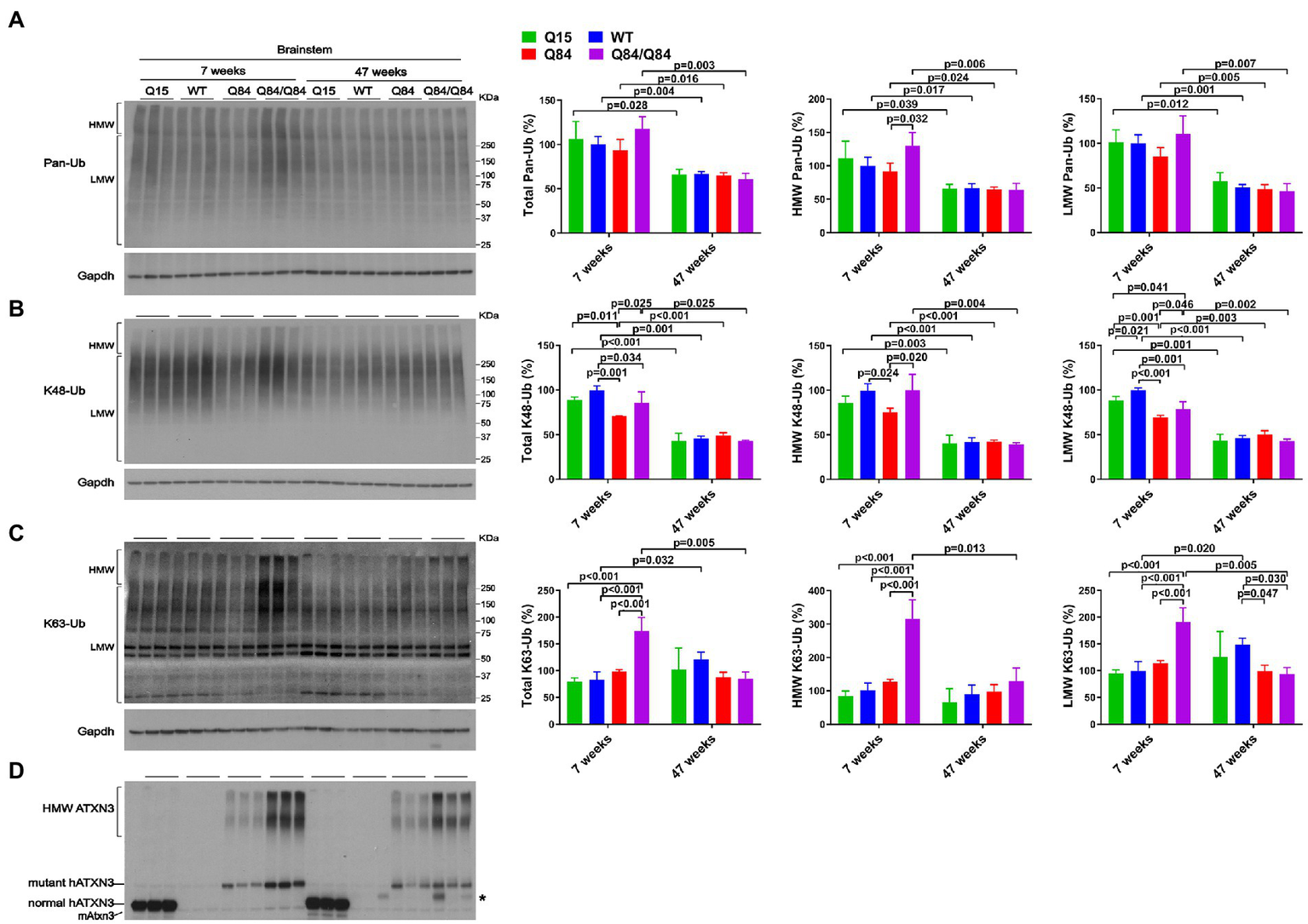Brainstem abundance of pan-Ub, K48-Ub, and K63-Ub was similar between Atxn3 KO and WT controls for both ages (Figures 2A–D), except for total pan-Ub amount, which was modestly decreased in 7-week-old Atxn3 KO compared to control mice (Figure 2A).