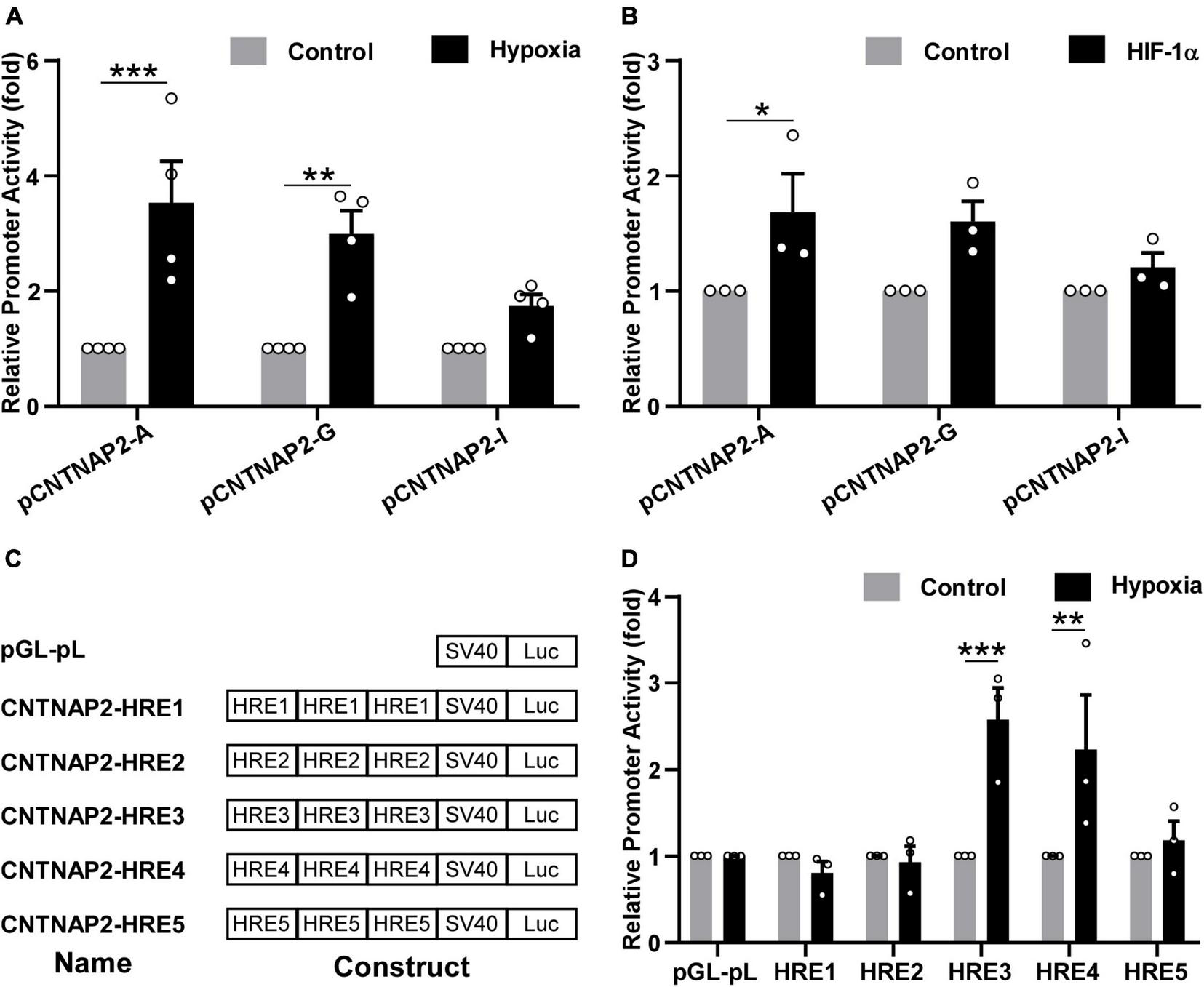 To further explore the functional HREs in the CNTNAP2 promoter, triple HRE1-5 were cloned into the pGL-pL vector and treated with hypoxia (Figure 5C). The activities of HRE3 and HRE4 were significantly increased by hypoxia to 2.57 ± 0.37 folds (p < 0.001) and 2.23 ± 0.63 folds (p = 0.0051) respectively. In contrast, activities of HRE1 (0.81 ± 0.13 fold, p = 0.992), HRE2 (0.93 ± 0.18 fold, p > 0.9999), and HRE5 (1.18 ± 0.22 folds, p = 0.9947) were not affected, suggesting that HRE3 (5′ acgtg, −754 to −750 bp) and HRE4 (5′ gcgtg, −35 to −31 bp) in the human CNTNAP2 promoter are functional (Figure 5D). In summary, these results demonstrate that hypoxia upregulates CNTNAP2 expression by interacting with functional HREs in the CNTNAP2 promoter.