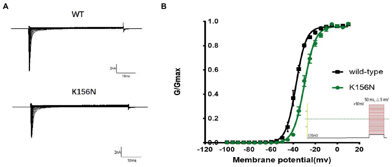 (A) Representative current recordings. (B) Voltage dependence of channels activation for wild-type (n = 15) and K156N variant (n = 15) using the voltage protocol shown as an inset.
