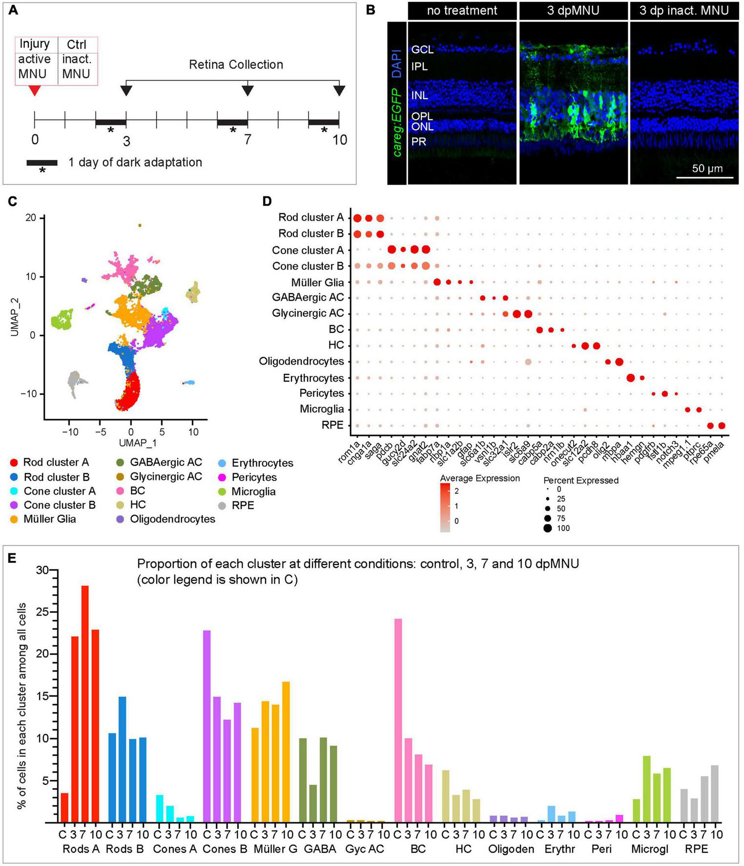 scRNA sequencing of careg:EGFP regenerating adult zebrafish retinas following MNU chemical injury. (A) Experimental design of retina isolation used for scRNA-sequencing. (B) Transversal sections of uninjured and regenerating careg:EGFP retinas at 3 days after treatment with harmful or inactivated MNU. careg:EGFP expression (green) is not detected after treatment with inactivated MNU, suggesting absence of injury. N = 3. (C) UMAP plots of the integrated cell RNA-sequencing data showing cluster assignments for each cell type collected from control and post-MNU treated retinas. (D) Dot plot showing expression of canonical markers for all retina cell types. Dot size indicates the proportion of cells expressing the corresponding gene and the color gradient indicates the average expression levels. (E) Histogram displaying percentage of cells in each cluster per time-point.