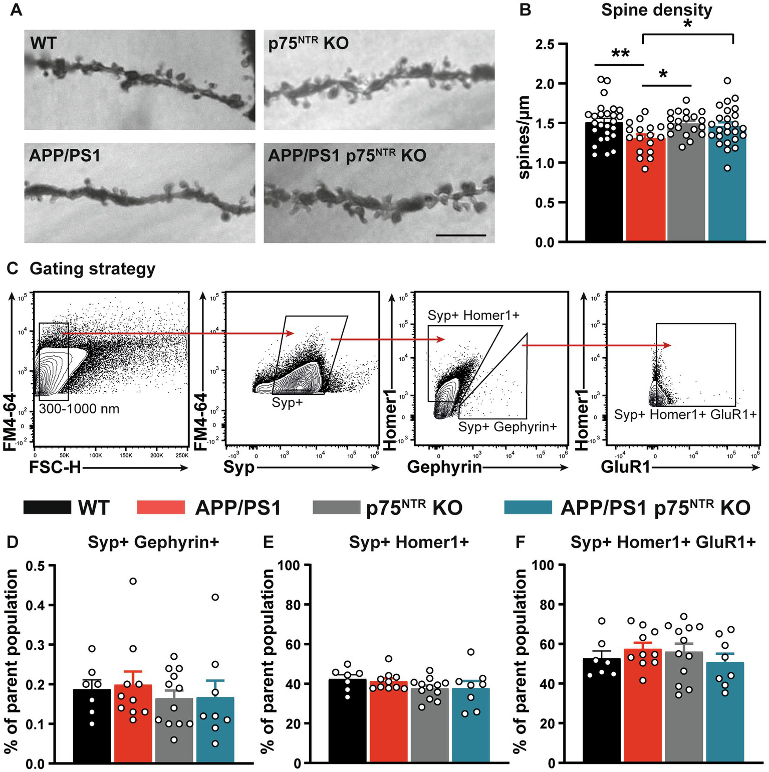 Taken together, the expression of p75NTR on cells of the nervous and immune system in the brain combined with its pleiotropic actions in regulating neuronal plasticity and immune response identify it as a potential molecule mediating the interplay between neurons and inflammation in the pathogenesis of AD. Thus, in this study, the effects of a p75NTR deletion in APP/PS1tg mice were assessed simultaneously on hippocampal activity-dependent synaptic plasticity, synaptic structure, immune activation, and cognitive performance.