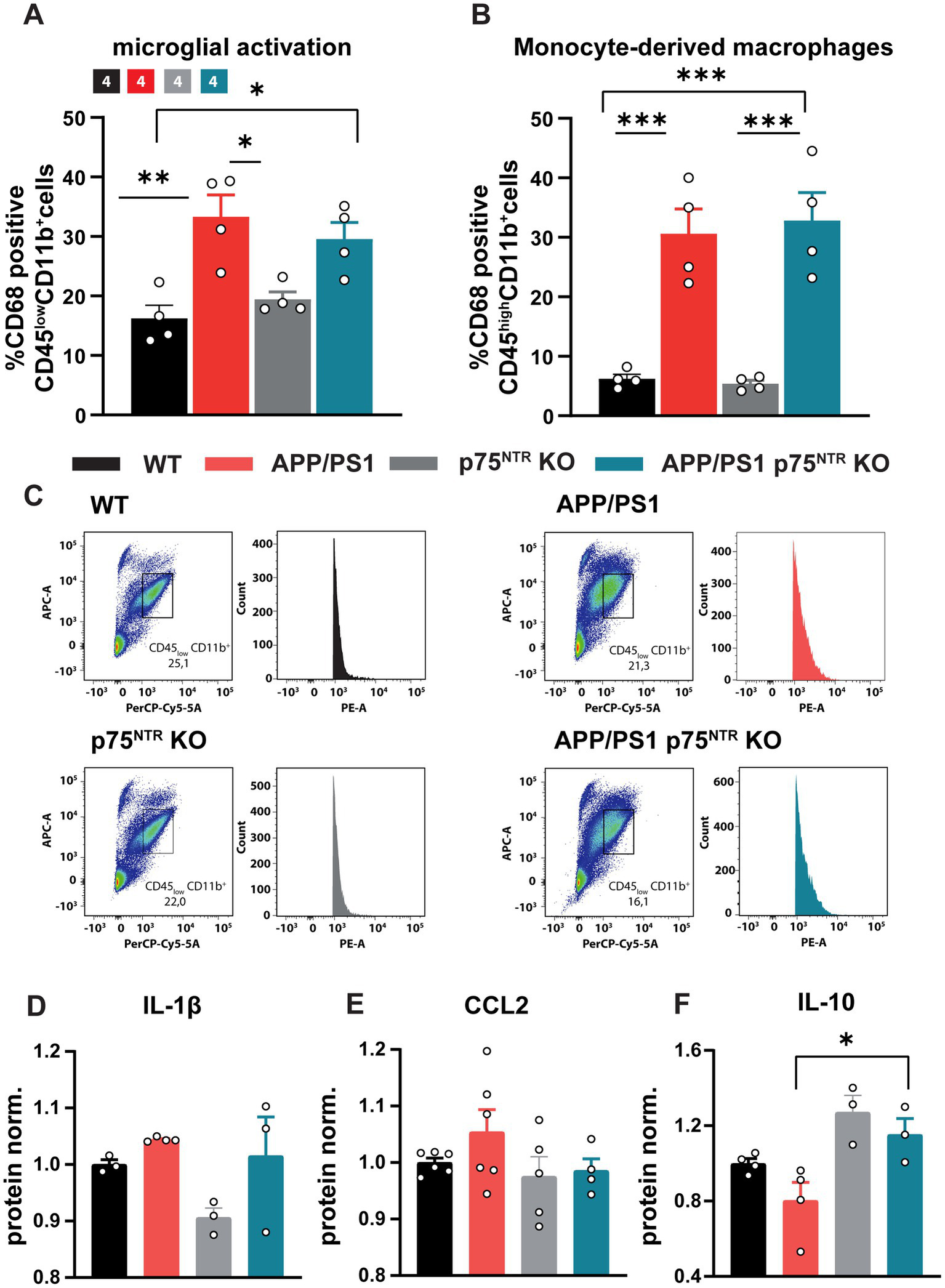 Knockout of p75NTR did not ameliorate microglia and monocyte-derived-macrophage (MDM) activation in 10 months old APP/PS1tg mice. (A,B) The CD68 expression of CD11b+/CD45low (microglia) and gated CD11b+/CD45high (MDM) cells normalized to WT was significantly enhanced in APP/PS1 and APP/PS1tg x p75NTR KO cells compared to controls. No reduction in the activation was observed comparing APP/PS1tg and APP/PS1tg x p75NTR KO probes. (C) Representative plots of the gated CD11b+/CD45low cell population and histogram of CD68 expression. Data are presented as mean ± SEM (N = 4) and one-way ANOVA of data, and post hoc Tukey multiple-comparisons test were performed. *p < 0.05, **p < 0.01, and ***p < 0.001 compared with control. (D–F) The graphs show respectively the relative expression levels of IL1ß, CCL2 and IL10 in the hippocampus of WT, APP/PS1tg, p75NTR and APP/PS1 x p75NTR KO mice.