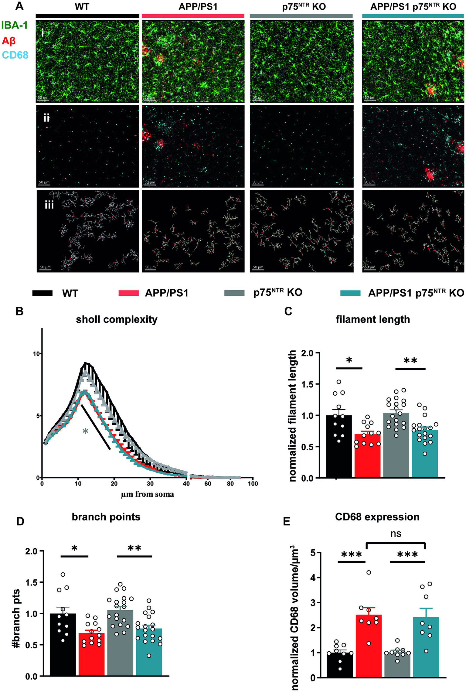 Deletion of the p75NTR did not influence the morphology of microglia in 10 months old APP/PS1tg mice. (A) Immuno staining of Iba1 (green), CD68 (cyan), and Amyloid-ß (red) in the CA1 area of the hippocampus from mice of all experimental groups (i + ii). Based on the staining, 3D filament models were generated, and the Sholl analysis was performed in IMARIS® (iii), scale bar = 50 μm. (B) Microglial complexity was reduced in APP/PS1tg and APP/PS1tg x p75NTR KO mice but not in controls. (grey* comparison to p75NTR KO). (C) Total filament length. (D) Branch points of Iba1+ cells were equally and significantly decreased in APP/PS1tg and APP/PS1tg x p75NTR KO mice compared to controls. Deletion of p75NTR KO did not influence this result. (E) Expression of CD68 within microglia (shown as CD68+ volume) was significantly increased in APP/PS1tg and APP/PS1tg x p75NTR KO mice but not in controls. However, deletion of p75NTR did not result in significant differences in CD68 expression in APP/PS1tg mice (N = WT:4; APP/PS1tg: 4; p75NTR KO: 7; APP/PS1tg x p75NTR KO: 7 animals per group n (number of ROIs) = 3 per animal). Data are presented as mean ± SEM. Two-way repeated measures ANOVA in (B), ordinary one-way ANOVA of data (C-E), and post hoc Tukey multiple-comparisons test were performed. *p < 0.05, **p < 0.01, and ***p < 0.001 compared with control.