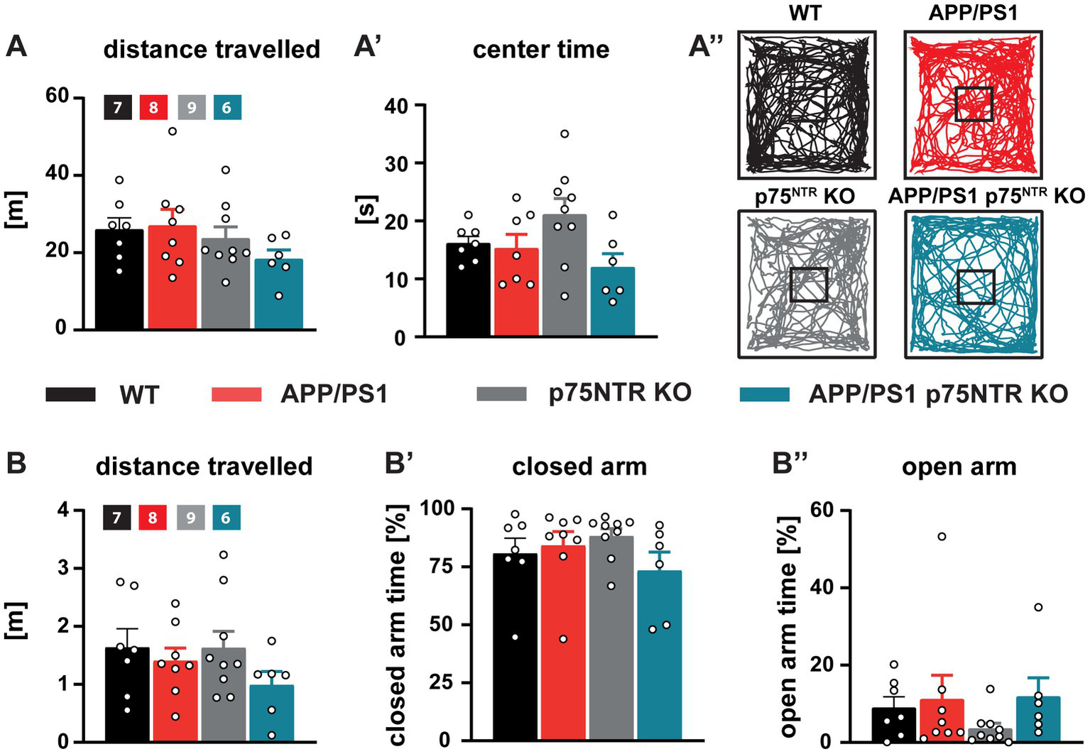 General locomotion, willingness to explore, and anxiety behavior were unaffected in APP/PS1tg and APP/PS1tg x p75NTR KO mice. (A, A’) The total distance traveled and time spent in the center area of the open field arena were similar in all groups. (A”) Representative track plots of the movement of WT, APP/PS1tg, p75NTR KO, and APP/PS1tg x p75NTR KO animals in the open field arena. (B-B”) The total distance traveled, and time spent in the closed and open arms of the elevated plus maze did not differ between the experimental groups. Data are presented as mean ± SEM (N = 6-9), ordinary one-way ANOVA of data and post hoc Tukey multiple-comparisons test were performed.