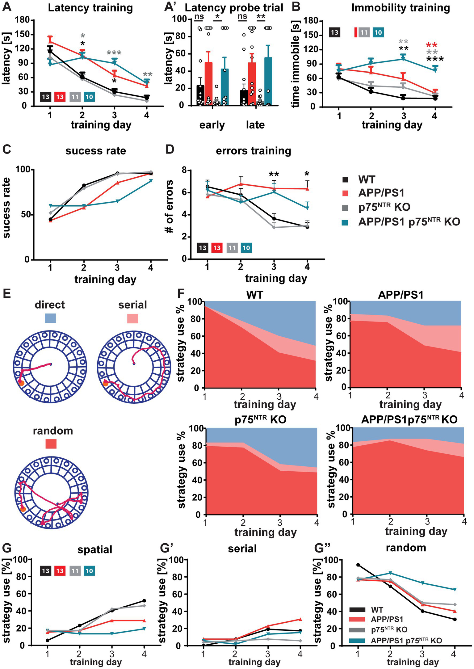 Deficits in spatial learning and memory in APP/PS1tg mice were not rescued by p75NTR deletion. Spatial memory was assessed using the Barnes maze task (A-A’). The latency to locate the target hole in the Barnes maze during the training session and probe trials were elevated in APP/PS1tg and APP/PS1tg x p75NTR KO animals compared to controls. Deletion of p75NTR did not rescue the deficit. (B) The time spent immobile during training in the Barnes maze was similar in WT, APP/PS1tg, and p75NTR KO mice; however, APP/PS1tg x p75NTR KO mice displayed significantly higher immobility. (C) APP/PS1tg mice were less successful in solving the task by escaping the maze through the escape hole compared to controls (success rate). A p75NTR KO did not improve the success rate. (D) The APP/PS1tg mice showed a significantly higher number of errors in locating the target hole compared to controls; this defect was not rescued by p75NTR deletion. (E-G”) The analysis of the search strategies used to solve the task revealed no significant improvement in the spatial deficits displayed by APP/PS1tg mice after p75NTR deletion. APP/PS1tg and APP/PS1tg x p75NTR KO animals used less hippocampus-dependent and slightly more hippocampus-independent strategies. (E) Representative track plots for direct (hippocampus-dependent), serial, and random (hippocampus-independent) search strategies used to solve the Barnes maze task. (F) Area plot reporting the percentage of strategy use per experimental group. (G-G”) Graphs showing the direct comparison of experimental groups with regard to the search strategies. Two way repeated measures ANOVA and post hoc Tukey multiple-comparisons test were performed. *p < 0.05, **p < 0.01, and ***p < 0.001 (grey* comparison to p75NTR KO, black* comparison to WT, red* comparison to APP/PS1tg).