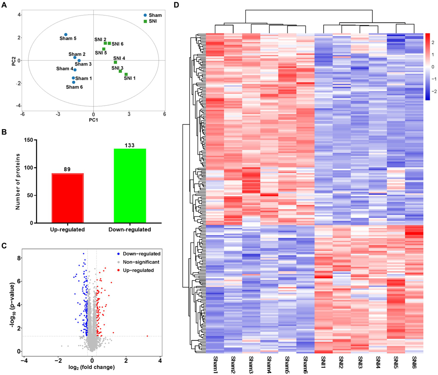 General transcriptomic outcomes. (A) Principal component analysis indicated a near-complete separation of genes in the sham (blue) and SNI (green) groups. (B) In all, 40 genes were upregulated, and 739 genes were downregulated. (C) Volcano plot shows differentially expressed genes. The red and blue dots indicate significantly upregulated and downregulated genes, respectively. (D) Hierarchical cluster analysis. Red indicates upregulation, and blue indicates downregulation. The dendrograms represent the classification of genes. The number in the color scale indicates the z-score.