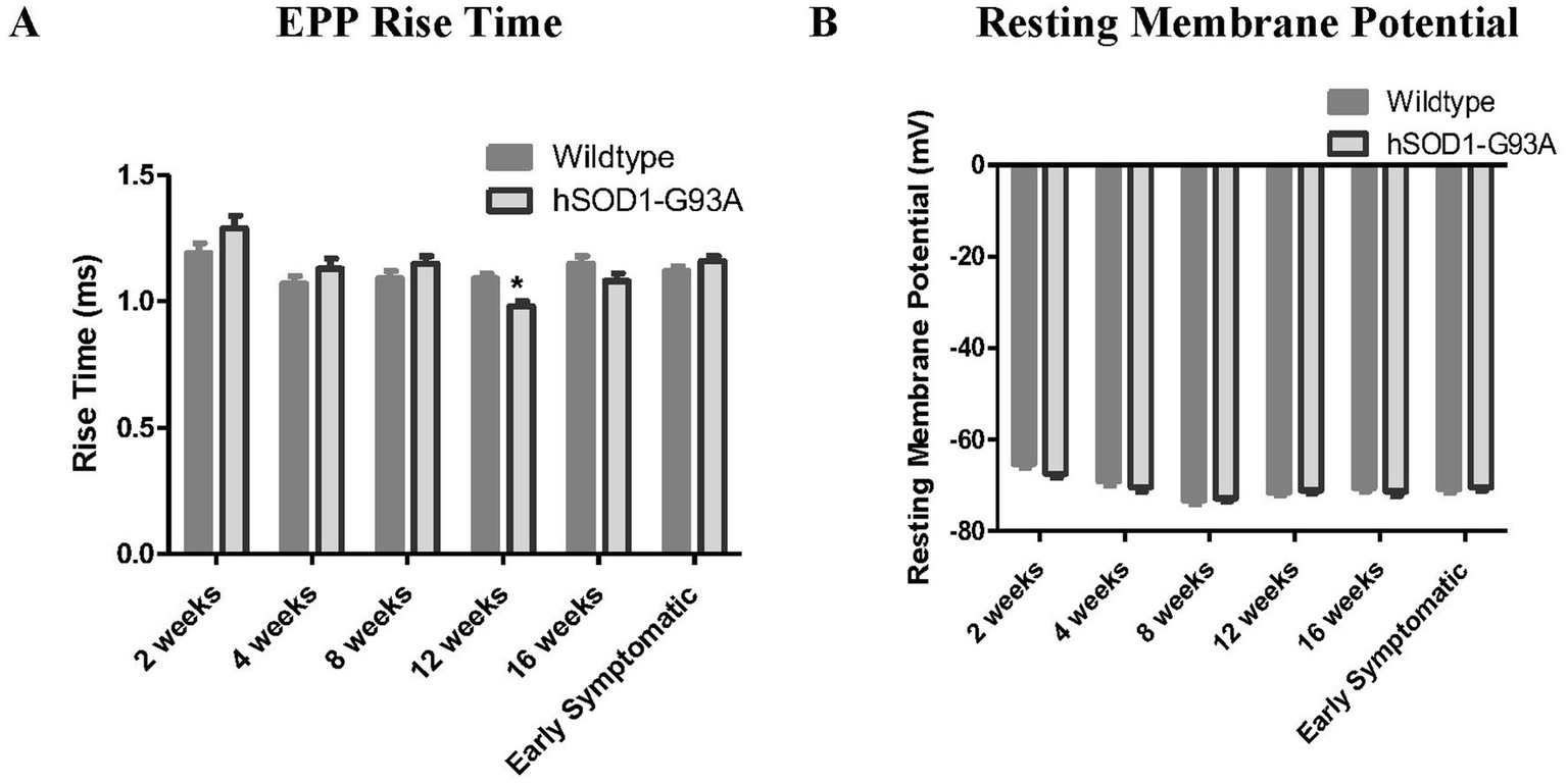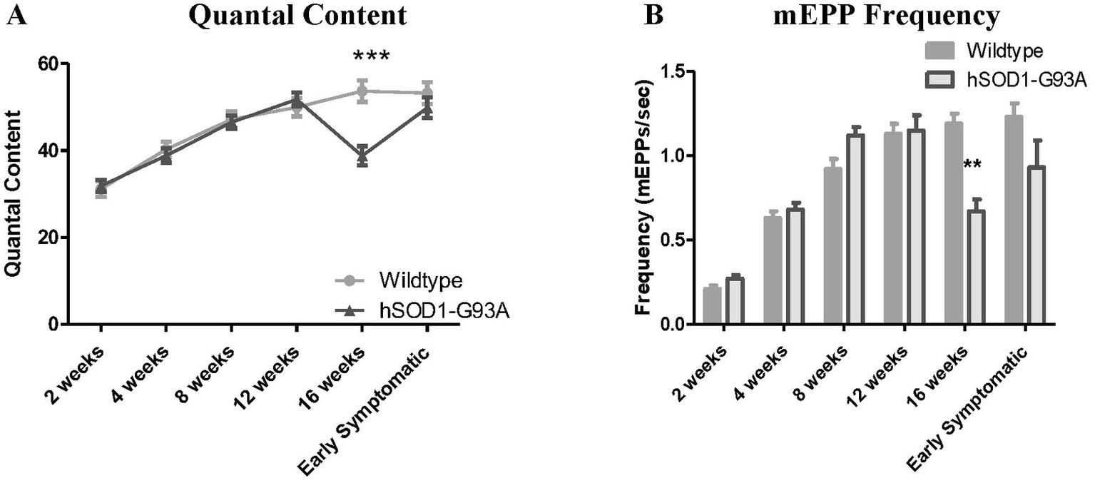We employed electrophysiological recording of NMJ postsynaptic potentials for spontaneous and nerve stimulation-evoked responses. This was correlated with fluorescent imaging microscopy of the postsynaptic acetylcholine receptor (AChR) distribution throughout the postnatal developmental timecourse from 2 weeks to early symptomatic ages.
