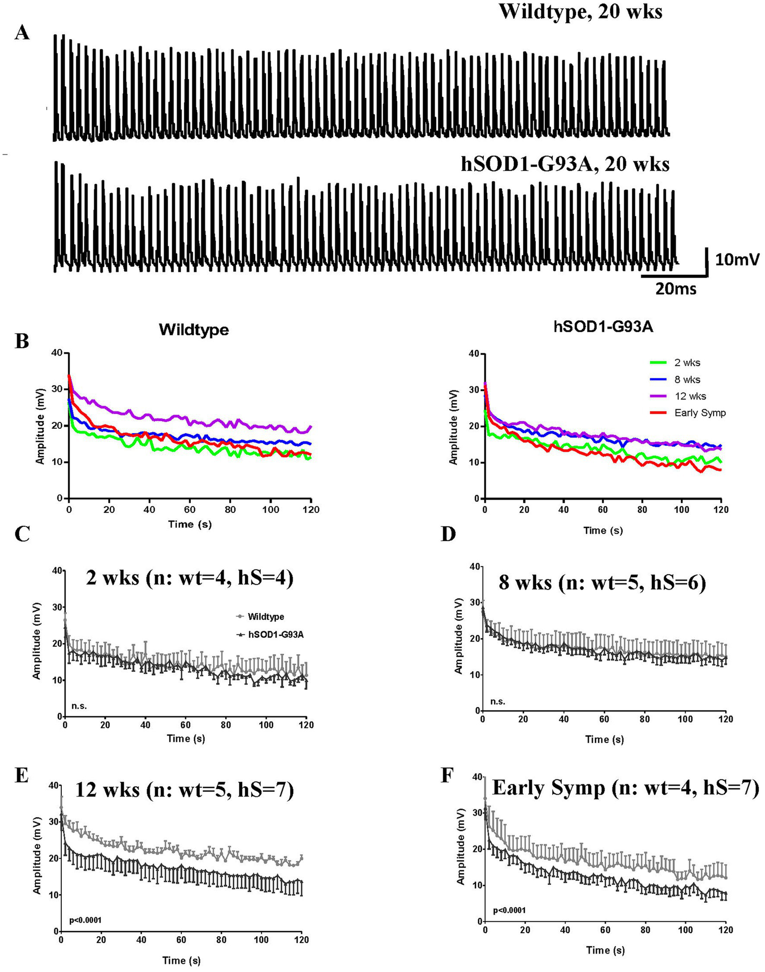 All experiments were carried out at the University of Aberdeen and approved by the Animal Welfare and Ethical Review Board, and Home Office (HO) license to GSB. Animals were kept in standard husbandry conditions within HO guidelines (group housed, cardboard tube and climbing rod environmental enrichment, bedding of corncob, wood shavings and paperwool, changed weekly, at 19–21°C, 45–65% relative humidity, 12 h dark:12 h light cycle, ad libitum access to standard chow and drinking water). All mice were checked daily. ARRIVE guidelines were followed except that blinding and full randomization were not possible. The HO license required all early symptomatic animals to be used within 24 h of hindleg tremor being detected. Thus, experiments on symptomatic hSOD1-G93A mice occurred within 24 h of animal facility notification after their daily checks. Pseudorandomization of age and genotype occurred by default, as animal usage was determined by small litter size (usually <6), date of birth/usage, only 1 animal (2 hemidiaphragms) maximum per day, experimentation only on weekdays, age-and littermate matching, and within the ±2 days of age required, and equalizing age group sizes. hSOD1-G93A mice founders were male B6SJL-TgN (SOD1-G93A)1Gur/J (SOD1G93a) from the University of St Andrews colony, that were established and maintained on a congenic C57bl/6 background strain from the University of Aberdeen colony. hSOD1-G93A and wildtype mice from the same litter (see Table 1; Age range, weight range and number of animals used for electrophysiology) were killed by cervical dislocation [Schedule 1 approved method, Animals (Scientific Procedures) Act 1986 incorporating European Directive 2010/63/EU]. Mice were killed at 2, 4, 8, 12, 16, or 20 weeks (wild-type mice) (±2 days) or when motor symptoms first appeared (hSOD1-G93A mice), which was 18–22 weeks of age. All mice came from the same colony, and in the great majority of cases the wild-type mice were littermates of the hSOD1-G93A mice of the corresponding age. The genotype of mice was determined at 2 weeks, when each mouse was given an unique identifying ear clip.