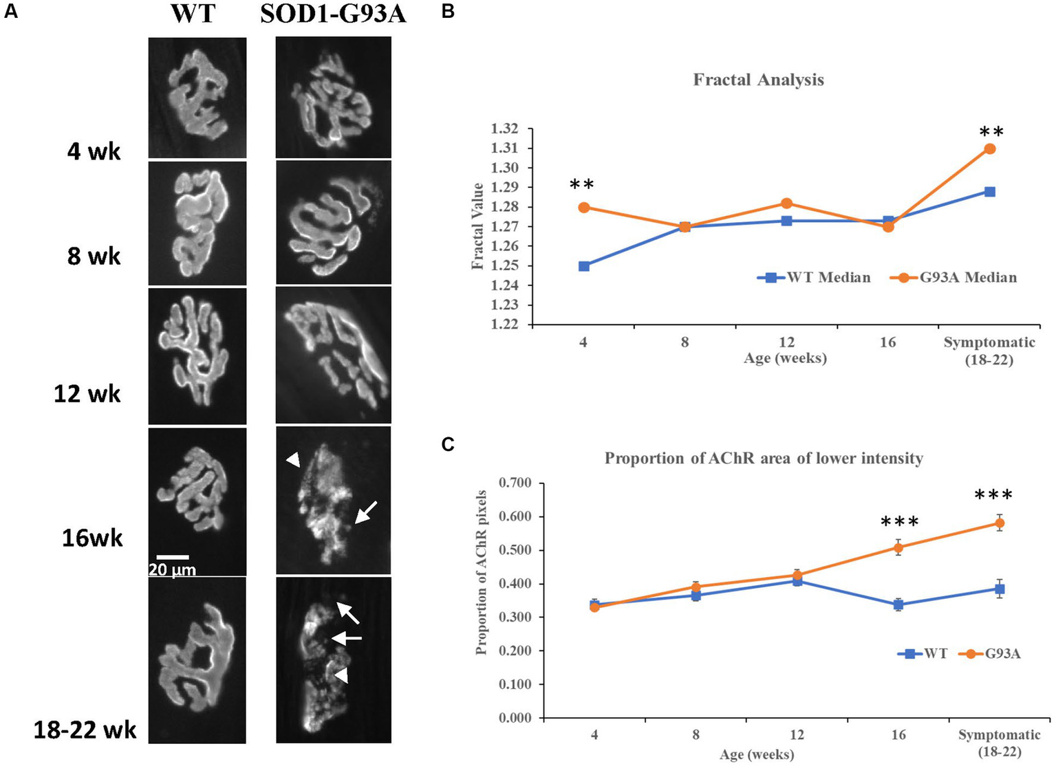 McIntosh J, Mekrouda I, Dashti M, Giuraniuc CV, Banks RW, Miles GB and Bewick GS (2023) Development of abnormalities at the neuromuscular junction in the SOD1-G93A mouse model of ALS: dysfunction then disruption of postsynaptic structure precede overt motor symptoms. Front. Mol. Neurosci. 16:1169075. doi: 10.3389/fnmol.2023.1169075