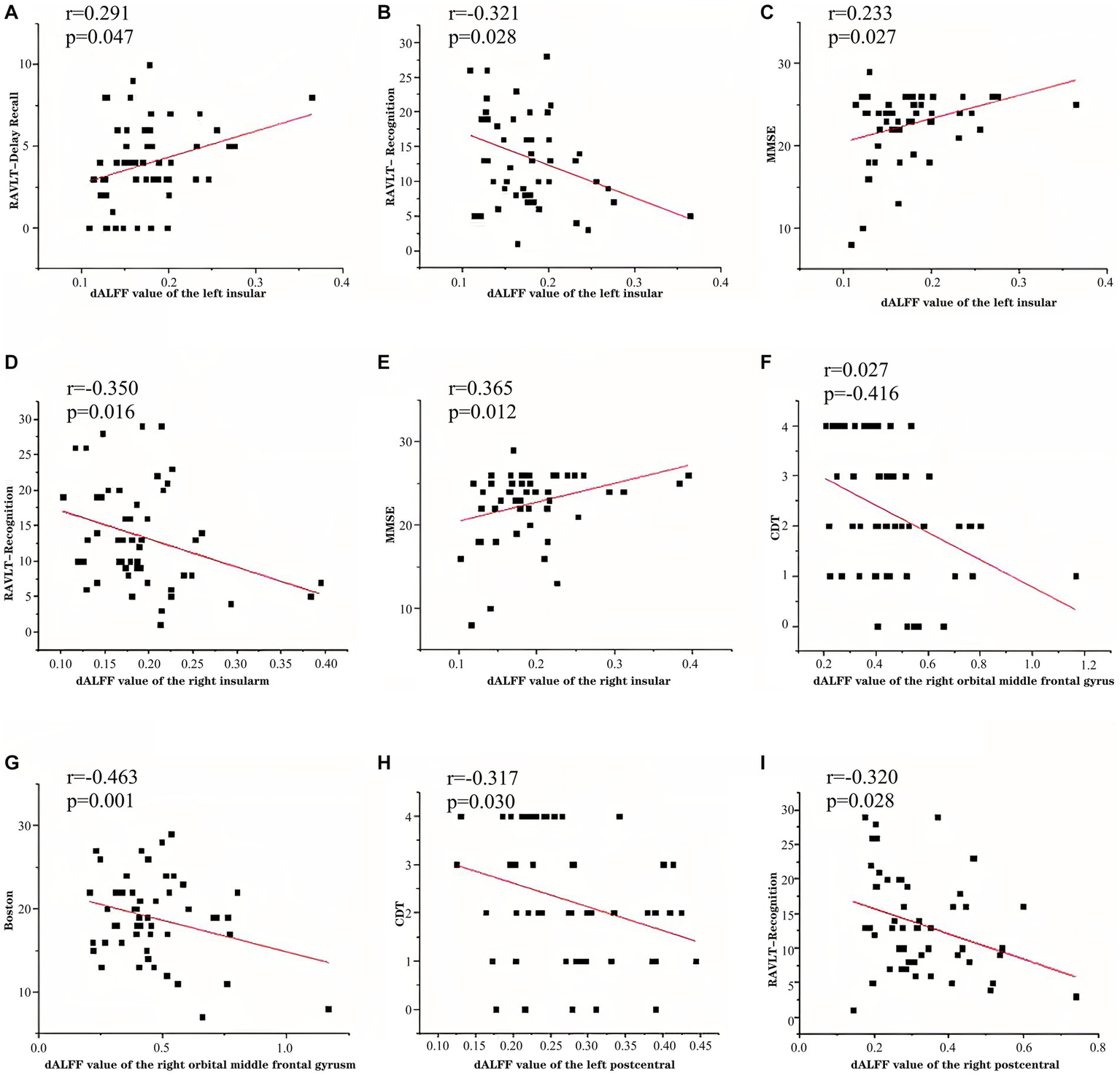 Finally, partial correlation analyses was used to examine the relationship between the brain regions with inter-group and intra-group differences in d-ALFF and the neuropsychological scale, and age, sex, and years of education were taken as regression variables. Calculate p-value and partial correlation coefficient (r-value). A p < 0.05 was considered statistically significant.