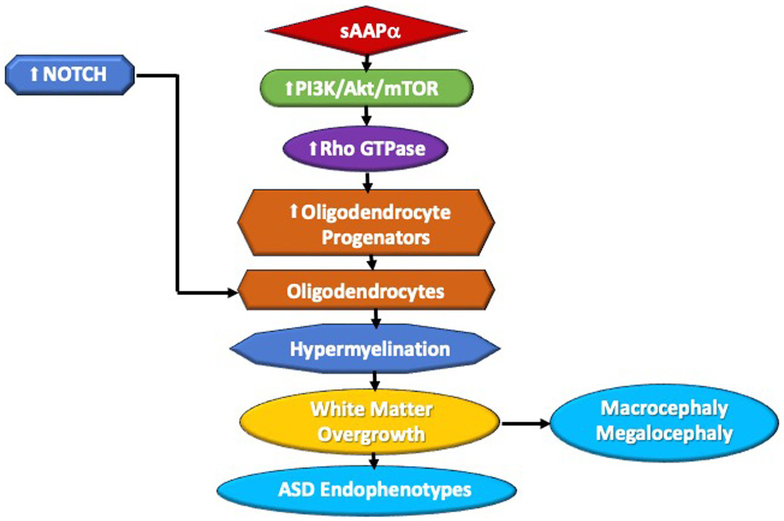 A schematic of sAPPα ‘s potential contribution to macrocephaly in ASD via the PI3K/Akt/mTOR/Rho GTPase translation pathway. Elevated sAPPα enhances PI3K/Akt/mTOR pathway activity, leading to activation of rho GTPase. The GTPase stimulates oligodendrocyte progenitors, which utilize NOTCH activity to mature into oligodendrocytes. Increased oligodendrocytes favor hypermyelination, which would lead to white matter brain overgrowth. The white matter overgrowth would contribute to ASD endophenotypes, i.e., macrocephaly, poor social functioning, or regression.