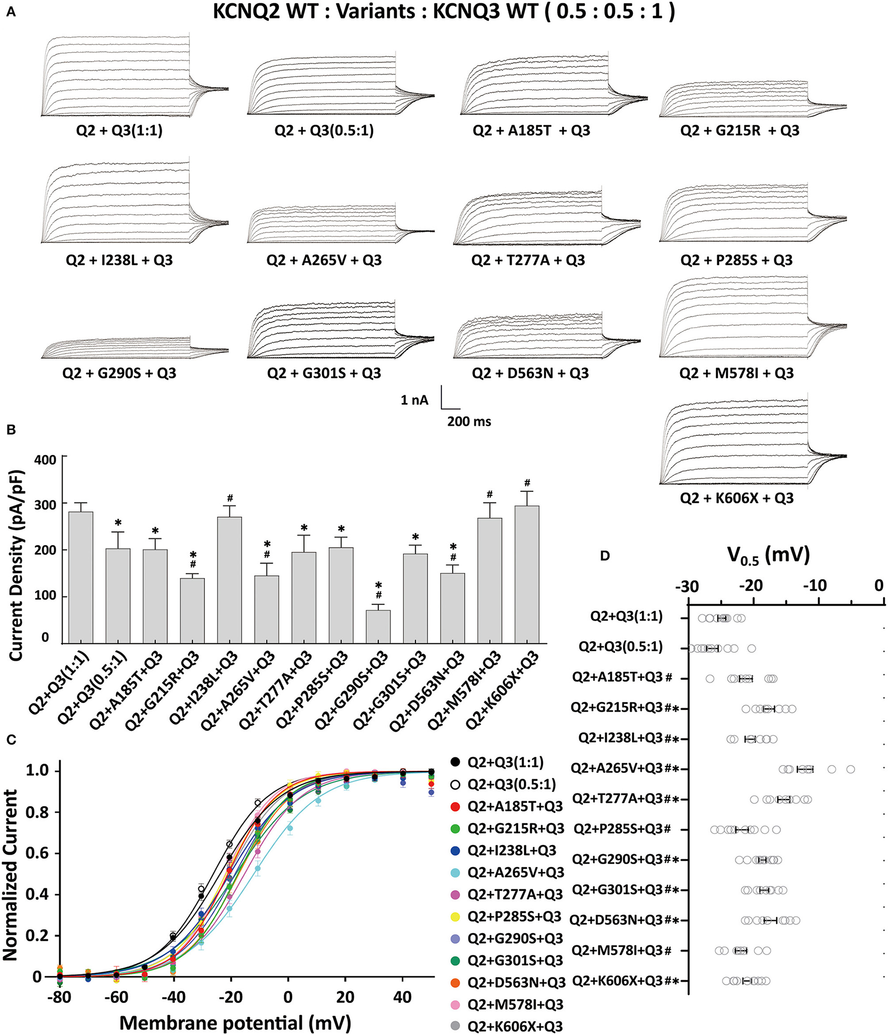 Functional properties of the KCNQ2 variants coexpressed with WTKCNQ2. (A) Macroscopic current traces recorded in CHO cells transfected KCNQ2 variants with WTKCNQ2in a 1:1 ratio (1.5 μg:1.5 μg). Current scale, 250 pA; time scale, 200 ms. (B) The mean current densities of the KCNQ2 variants coexpressed with WT in a 1:1 ratio at +40mV. (C) Current–voltage relationships of KCNQ2 variants coexpressed with WTKCNQ2 in a 1:1 ratio determined from tail current amplitudes. Lines represent fits of a Boltzmann function. (D) Differences in activation of V0.5 were determined for the KCNQ2 variants and WTKCNQ2 in a 1:1 ratio (n = 8–15). Statistically significant differences *p < 0.05 versus WT KCNQ2.