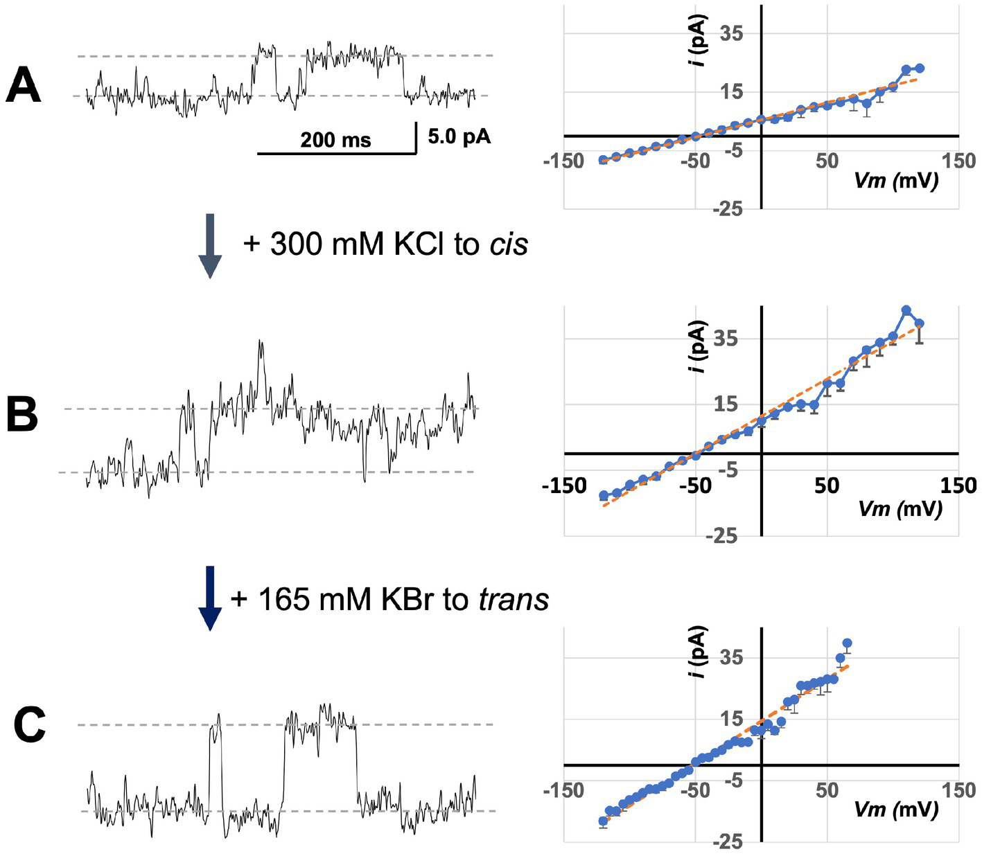 Sensitivity of bCHGB channels to varying anion compositions. The same channels in a lipid bilayer were first recorded in solutions containing (cis/trans mM: 150 KCl/30 KCl + 285 KBr) (A). The left trace showed single channel events at 0.0 mV. Afterwards, 300 mM KCl was added to the cis side before the recording at 0 mV in panel (B), and after that, 165 mM KBr was added to the trans side before the recording at 0 mV in panel (C). Recordings on a series of Vm and from different membranes were obtained for analyses. The single channel currents <i> - Vm plots (right side) were obtained from 4 different sets of recordings. Errors: s.d., n = 4. The average single channel currents at 0 mV were 5.4 ± 0.1, 10.2 ± 0.4, and 13.4 ± 0.2 pA in panels (A–C), respectively. Linear fittings (orange dashed lines) were performed to estimate average single channel conductances <g > (~110 ± 7 pS, 196 ± 10 pS and 275 ± 14 pS in panels (A–C), respectively; errors: s.d., n = 4), and reversal potentials (Erev = −49 ± 1.7, −46.8 ± 1.2 and − 52.0 ± 0.2 mV in panels (A–C), respectively; errors: s.d., n = 4). Their differences are all significant with p < 0.05. The single channel currents increased monotonically after KCl or KBr was added to the cis or trans side, and the <g > also changed accordingly.