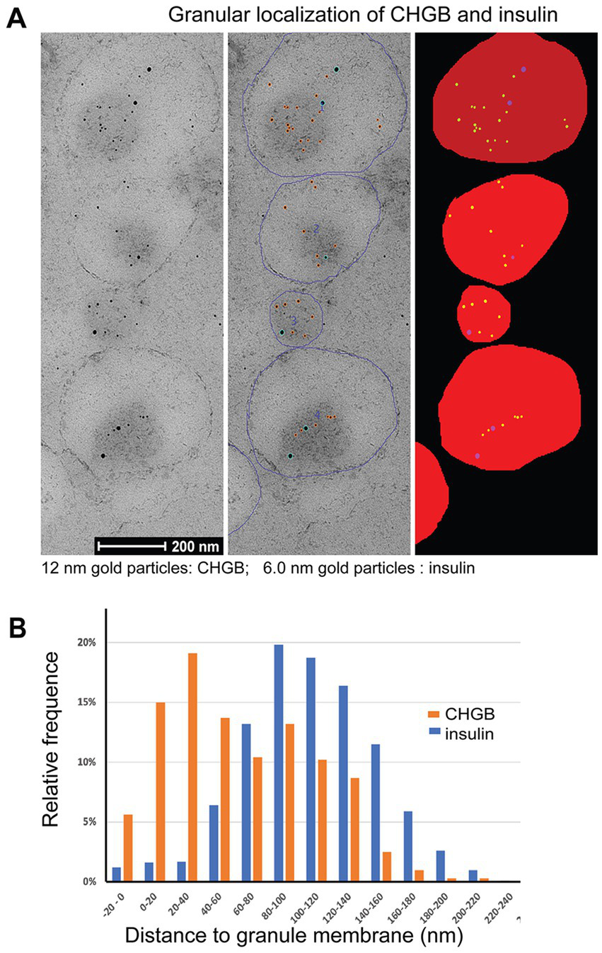 Rat pancreatic islets were isolated and high-pressure frozen as described (van Weering et al., 2010; Fava et al., 2012). They were subsequently freeze-substituted to Lowicryl HM20 (van Weering et al., 2010) using the pre-prepared MonoStep version (PolySciences Inc.). After UV polymerization 70 nm sections were collected on pioloform-coated copper slot grids. Immuno gold double labeling was performed as described (Verkade et al., 1997; van Weering et al., 2010) using a mouse monoclonal antibody against insulin (Cell Signaling, I6B10) at a dilution of 1:100, and a polyclonal rabbit CHGB antibody (H-300, 1:10). The primary antibodies were detected using 6 and 12 nm gold coupled anti-mouse and anti-rabbit antibodies (Aurion, Wageningen, The Netherlands). Experiments were carried out both with anti-mouse 6 and 12 nm gold and anti-rabbit 12 and 6 nm, respectively. Controls included leaving out one or both primary antibodies which resulted in the lack of the respective gold label(s). To make a robust statistical analysis the density of the stained molecules per granule was kept low, and ~ 320 granules were included in the dataset for image analysis (next section). Samples were analyzed on a FEI Tecnai12 BioTwin TEM, equipped with a bottom-mount Ceta camera (Thermo Fisher). Images were exported as TIF files with scalebars incorporated so that they could be imported and calibrated in Fiji for subsequent analysis.