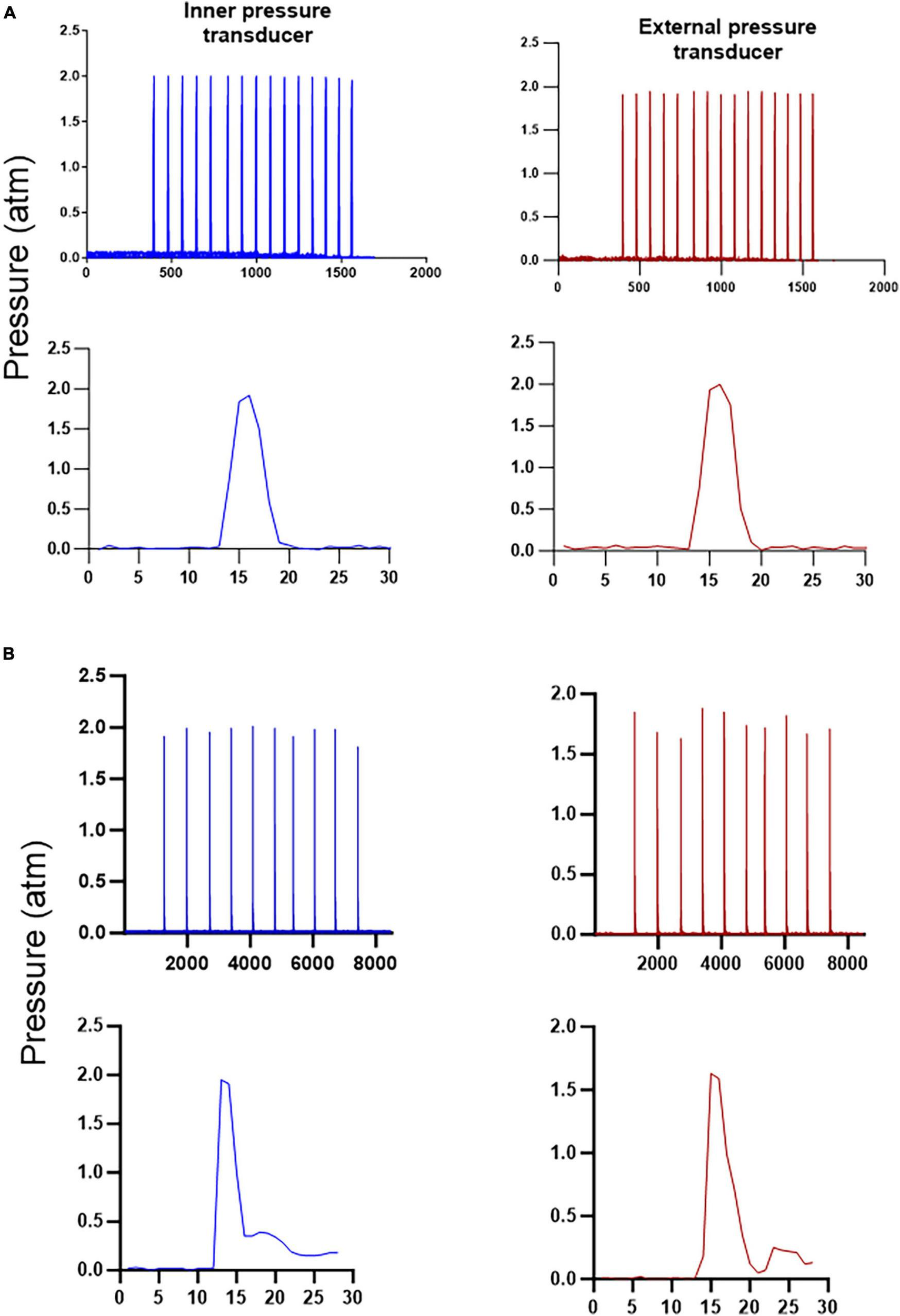 The hydropneumatic device offers the advantage of easily purging the system of bubbles by simply pressing the purge button twice. This step opens the two valves simultaneously for one second. Subsequently, to ensure the uniformity of the pressure pulses in terms of intensity and duration, several pressure pulses were generated and monitored. In this test, the third button was pressed to obtain a pressure profile monitored by the two pressure transducers for several pulses. The initial pressure was set at 2 atmospheres, and an analog manometer was used for monitoring. The pressure recorded in the internal and external transducers averaged 1.98 and 1.92, respectively, from 15 pulses, with a variability percentage of 0.9 and 0.6, respectively. These results indicate that there was no significant loss of initial pressure. The profiles of the two sensors exhibited similar characteristics when observed in detail (Figure 2A). These findings enabled the system to be used in experimental animals. In the similar test used to compare the reproducibility of the classical pendulum under the same circumstances (Figure 2B) the average pressure generated was 2.0 and 1.81 atmospheres for the internal and external transducers and the variability was 2.9 and 5.2 percent respectively, these results show a clear difference in generating a similar pulse manually versus electronically. Another difference easily to note is the characteristics of the pulse, in the case of pendulum, it shows a small bump after a rapid increase in the pressure, this waveform is similar to that published by Ouyang et al. (2018).