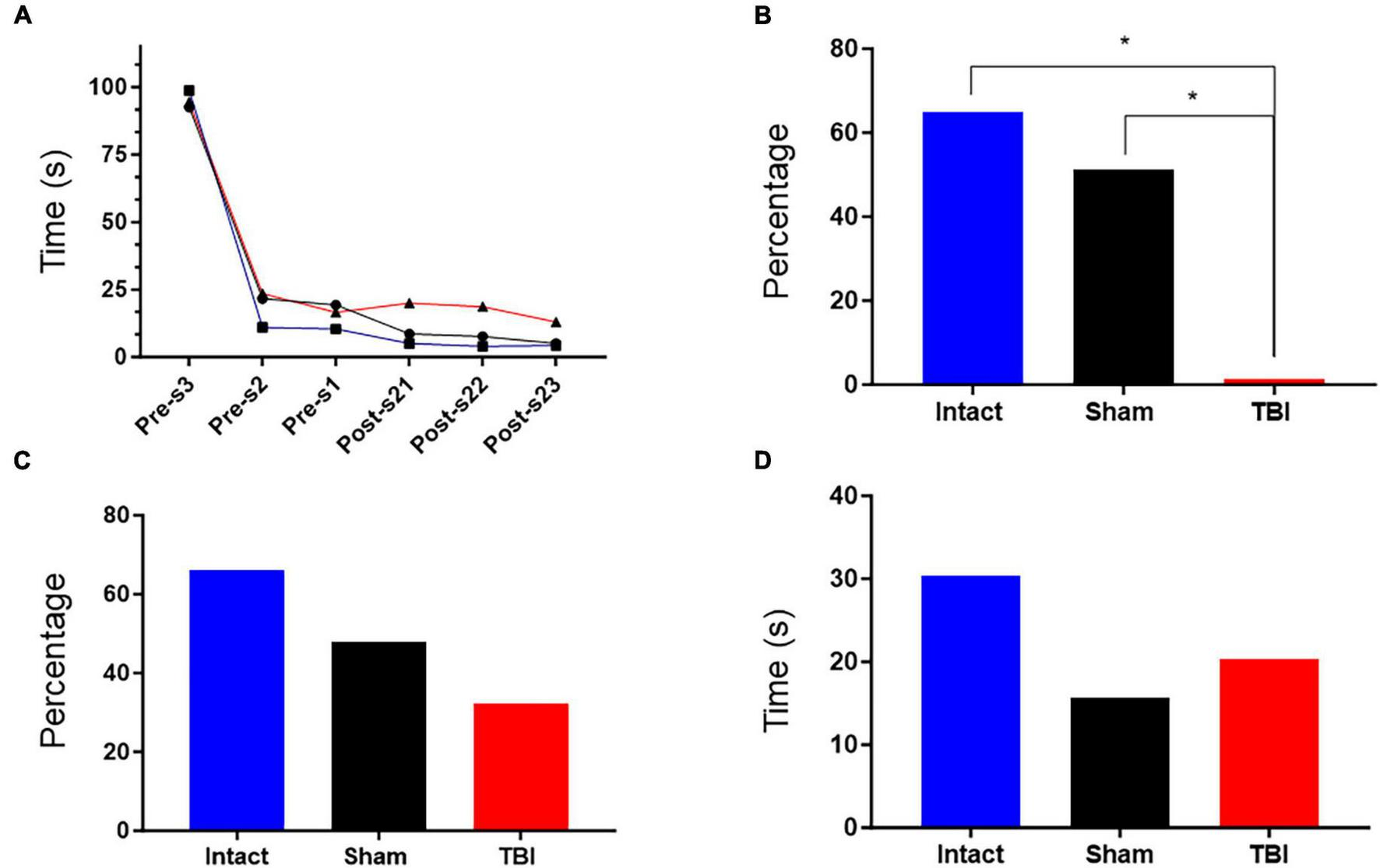 Results of the Morris Aquatic Maze (MAM). (A) Escape latency observed in rats from the TBI, sham, and intact groups. The escape latency was determined by averaging the time (seconds) each rat took to find the platform after being placed in the pool. Sampling points correspond to three days of training prior to surgery (pre-s at days 3, 2, and 1) and three days after surgery (post-s) at days 21, 22, and 23. *p < 0.05. (B) This graph shows the decrease in the percentage of time that the rat spent completing the escape task. The percentage was obtained by comparing the average total time spent completing the task during the pre-s habituation days to the average total time spent completing the task during the post-s habituation days, i.e., [100-(average time of post-s days*100/average time of pre-s days)]. (C) This graph shows the decrease in the percentage of time that the rat remained in the opposite quadrant. The percentage was obtained by comparing the mean time that the rat remained in the opposite quadrant on the evocation day during the pre-s phase to the mean time that the rat remained in the opposite quadrant on the evocation day during the post-s phase, i.e., [100-(mean time on post-s evocation day*100/mean time on pre-s evocation day)]. (D) This graph shows the time that the rats remained in the quadrant containing the platform. The value was obtained by averaging the time spent by rats in each group.