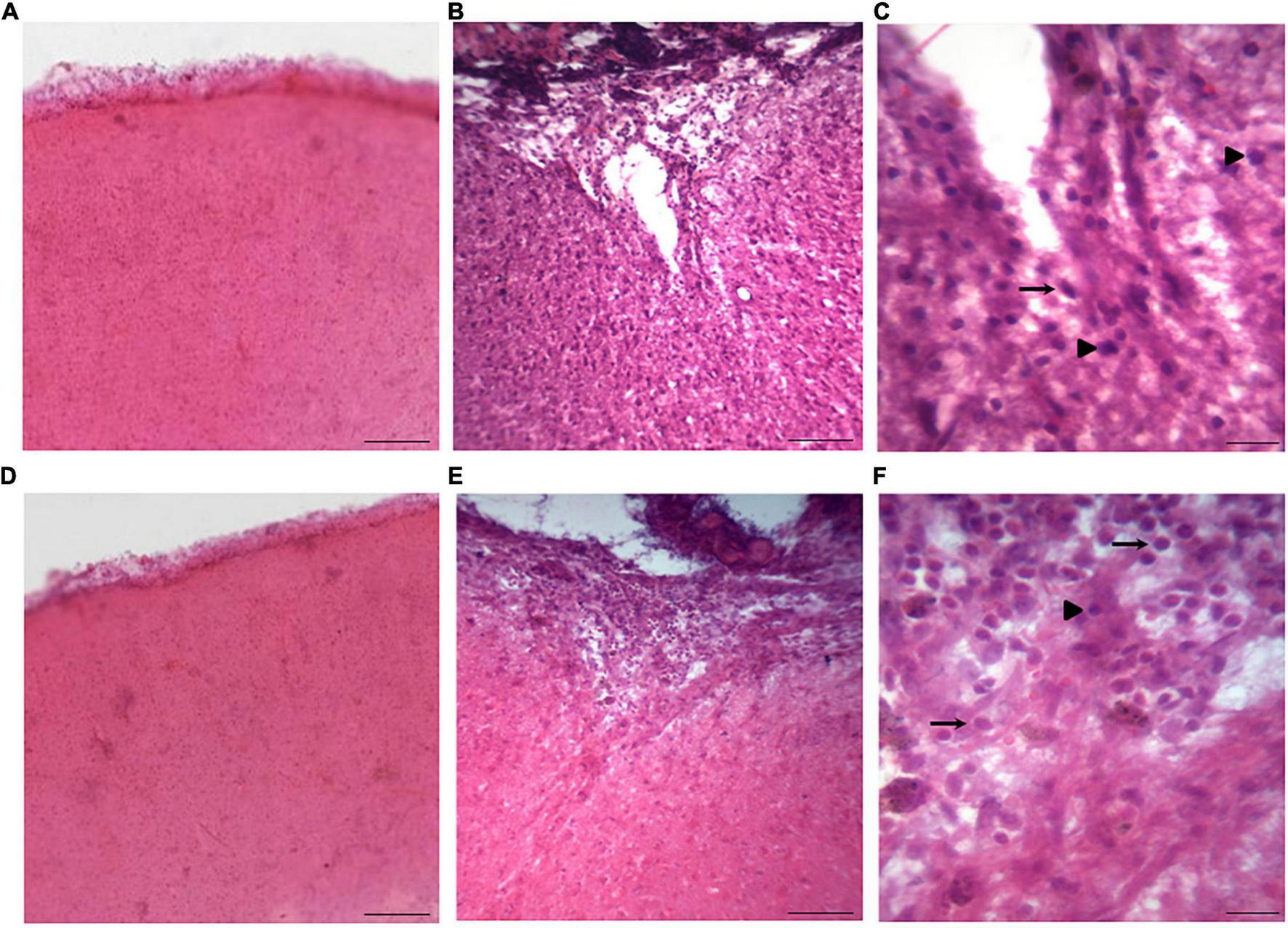 Coronal sections stained with H&E in rats from the sham and TBI groups. (A,D) Show representative images from the sham group with the same resolution, while (B) and (E) are pictures from the TBI group (injured rats) with the same resolution as in panels (A) and (D). In addition, (C) and (F) are low magnification pictures from panels (B) and (E), respectively. In the injured rats, tissue sections displayed damaged neurons around the lesion site, featuring nuclear pyknosis (indicated by head arrows) and cytoplasmic vacuolization (indicated by arrows), accompanied by tissue loss, in contrast to the sham group. The scale bar of images panels (A,B,D,E) corresponds to 500 μm, while scale bar of images of (C) and (F) corresponds to 100 μm.