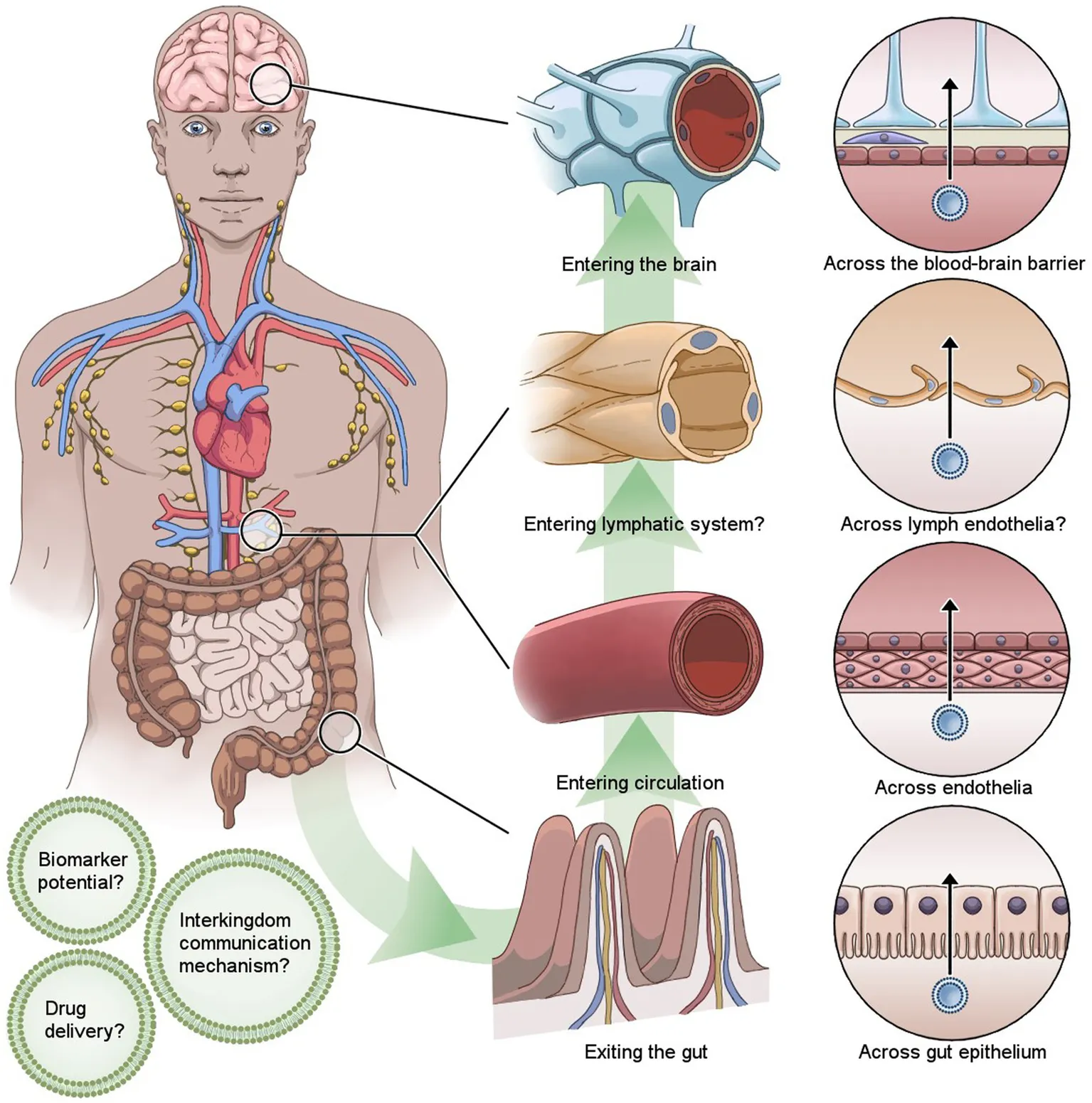 In this systematic review we summarize the present evidence of bacterial EVs crossing the BBB and highlight the importance of future research on gut microbiota-derived EVs in the context of gut-brain communication across the BBB.