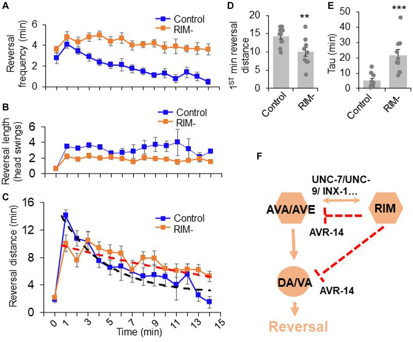 The dual role of RIM neurons in motor adaptation. Quantification of reversal properties in a motor adaptation assay. n = 10. Control groups of animals underwent surgical preparation without laser irradiation. (A) RIM ablation blocks the reversal frequency decline after worms were transferred to no-food environment. Error bars: SEM. n = 10. (B) RIM ablation decreases the reversal length after worms were transferred to no-food environment. SEM. n = 10. (C) Ablation of RIM neurons impairs motor adaptation after worms were transferred to no-food environment. Worms were placed in an environment with food (time = 0) and then transferred to a new environment without food (time = 1–15 min). The reversal strength is the sum of the total reversal distance (reversal head swings) in each minute. Dash lines were the fitting curves for the reversal strength of control and RIM-ablated groups (fitted with exp. function f(x) = y(0) + A*exp.(-invTau*x). Control: y(0) = 3.43, invTau = 0.249, A = 13.461; RIM: y(0) = −0.07, invTau = 0.042, A = 10.467). SEM. n = 10. (D) Ablation of RIM decreases the initial phase of the reversal strength (reversal strength of the 1st minute). Bar graph summarizes the 1st minute data in (C). **p = 0.0066 (unpaired two-sided t-test). (E) Ablation of RIM led to a slower decline in the reversal strength indicated by Tau value. ***p = 0.0006 (unpaired two-sided t-test). Tau values were derived from the fitting lines in (C). (F) Schematic model. RIM neurons acutely promotes reversals by promoting AVA/AVE activity via gap junctions. RIM also chronically inhibits AVA/AVE-A type motor neurons via an inhibitory glutamate pathway, thereby suppressing reversal probability over time.