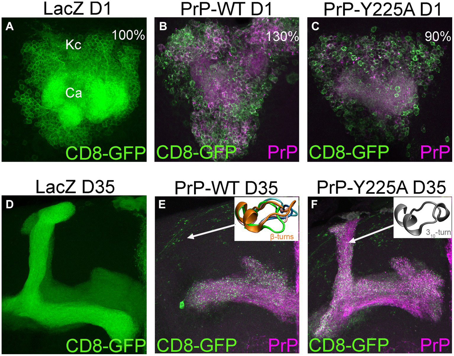 Degeneration of mushroom body neurons in Drosophila. (A,D) Control flies expressing the reporter LacZ in mushroom body neurons visualized with CD8-GFP (UAS-LacZ/UAS-CD8-GFP; OK107-Gal4). These clusters contain about 2,000 neurons [(A) The Kenyon cells, Kc] tightly packed in the posterior brain. Their dendritic fields or calyces (Ca) are located underneath the cell bodies. These neurons project to the anterior brain and project into dorsal or medial projections (D). (B,C) 1-day-old flies expressing human PrP-WT (UAS-human PrP-WT/UAS-CD8-GFP; OK107-Gal4) show expansion of the Kc clusters, averaging 30% increased surface compared to controls, whereas flies expressing Y225A (UAS-human PrP-Y225A/UAS-CD8-GFP; OK107-Gal4) show slightly smaller area. (E,F) 35-day-old flies expressing PrP-WT show progressive loss of axonal projections and this loss is minimized in flies expressing Y225A. Representative loop conformations are shown as insets. See Myers et al. (2023) for additional details.