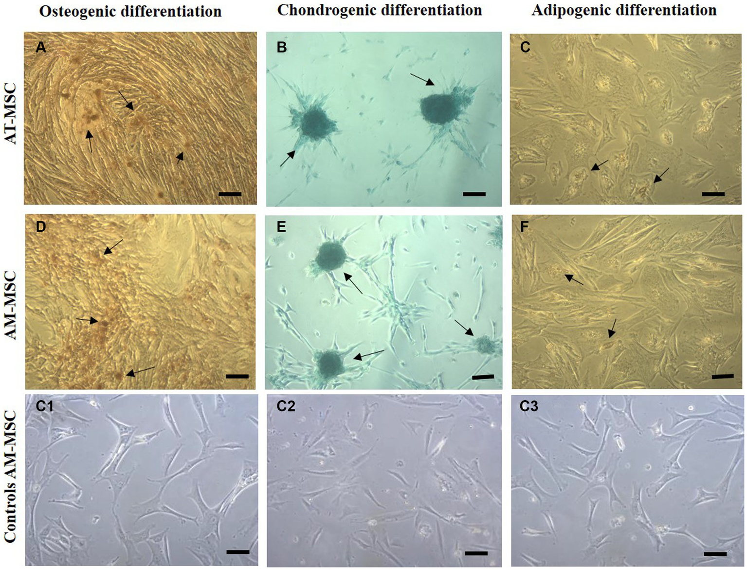 Multilineage differentiation of cells in passage 3. Canine AT-MSC and AM-MSC successfully underwent osteogenic (A,D), chondrogenic (B,E), and weaker adipogenic differentiation (C,F). Respective negative controls (C1,C2,C3) are shown as AM-MSC cells where no differentiation media was used.