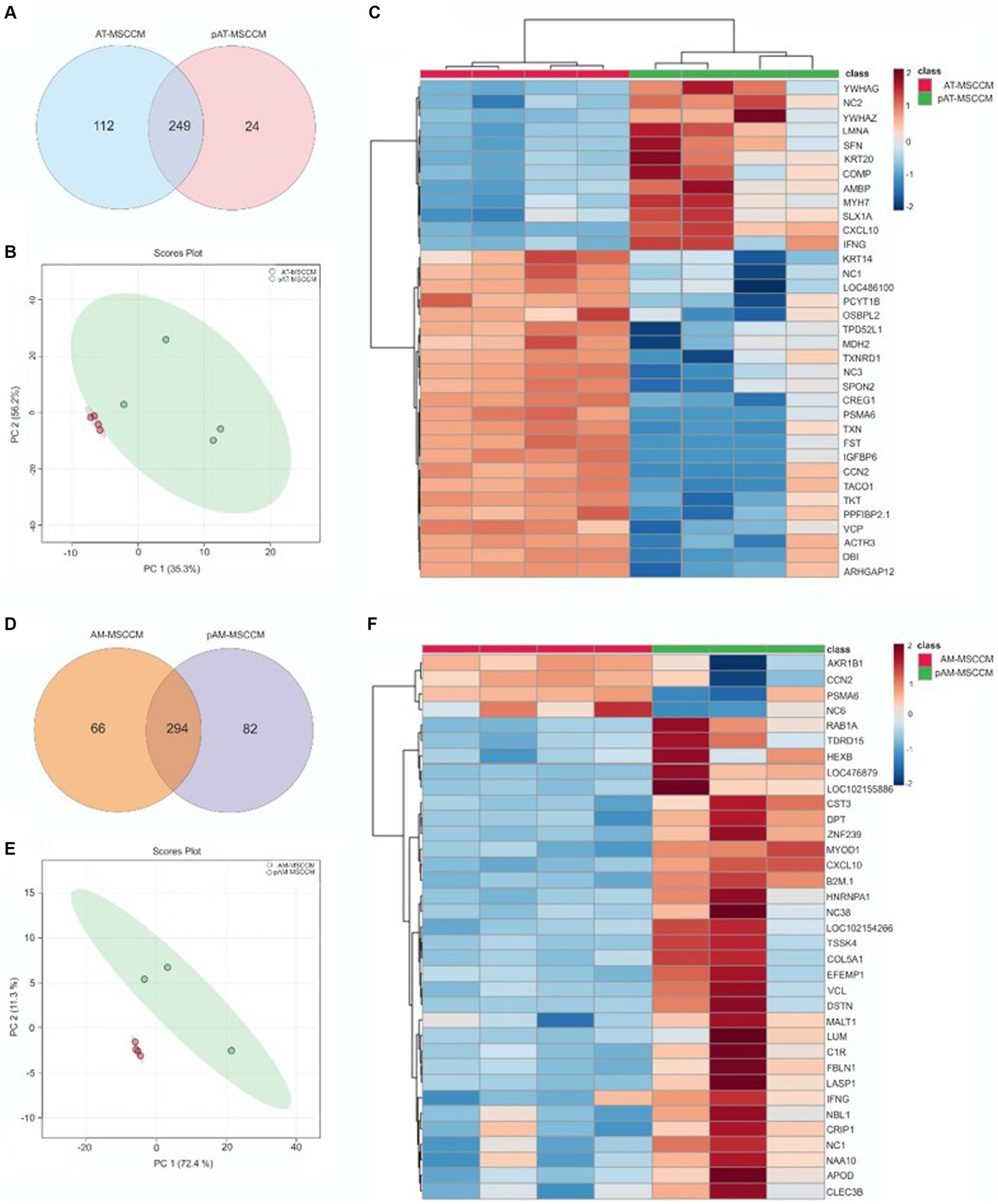 LC/MS–MS analysis of MSCCM and pMSCCM. (A,D) Venn diagrams representing the total amount of identified proteins in MSCCM and pMSCCM. (B,E) Principal component analysis scores plot showing clustering of MSCCM and pMSCCM. (C,F) Heat maps of differentially expressed proteins Red and blue colors represent up-regulated and down-regulated proteins, respectively.