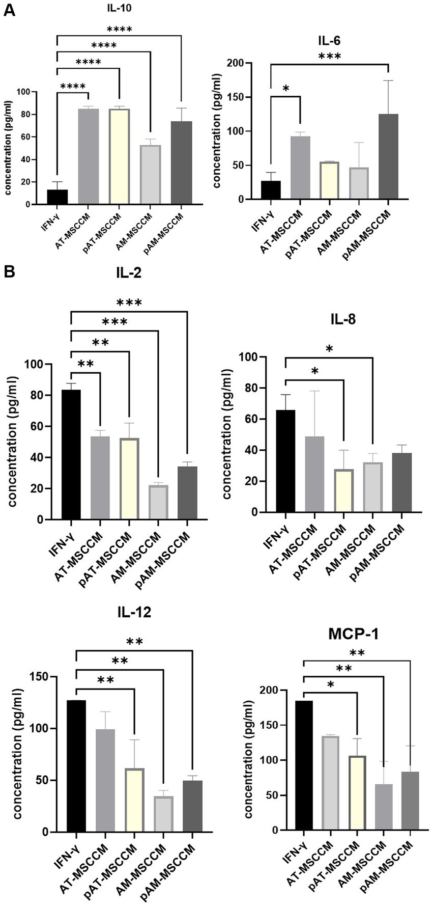 One of the aims of this study was to assess the effects of MSCCM on secretion profiles of cytokines, chemokines, and growth factors from cell line SH-SY5Y. Firstly, as expected pre-incubation of SH-SY5Y for 24 h with IFN-γ increased the output of pro-inflammatory cytokines IL-2, IL-6, IL-12/IL-23p40, chemokine IL-8 and monocyte chemoattractant protein 1 (MCP-1), on the other hand, the anti-inflammatory cytokine IL-10 output was decreased. Therefore, we considered this group as an IFN-γ group and studied whether additional treatment with MSCCM could reduce the value of pro-inflammatory and increase the value of anti-inflammatory cytokines/chemokines. Overall MSCCM significantly (*p < 0.05) or partially increased IL-10, IL-6 but decreased IL-2, IL-8, IL12 and MCP-1 output (Figures 6A,B). Interestingly, incubation with all MSCCM (AT-MSCCM, pAT-MSCCM, AM-MSCCM, pAM-MSCCM) significantly increased IL-10 (****p < 0.0001) with the highest increase detected in AT-MSCCM and pAT-MSCCM samples. For IL-6 a cytokine that can have both pro-inflammatory and anti-inflammatory properties depending on the context and concentration, pAM-MSCCM significantly increased IL-6 (***p < 0.001), followed by AT-MSCCM (*p < 0.05) while only a partial increase in groups of AM-MSCCM and pAT-MSCCM was detected. As for the concentration of proinflammatory mediators, we noticed a significant decrease in the concentration of cytokines IL-2 [significant decrease in AT-MSCCM (**p < 0.01), pAT-MSCCM (**), with the highest decrease in AM-MSCCM (***) followed by pAM-MSCCM (***)], IL-8 [significant decrease in pATMSCCM (*) and AM-MSCCM (*)], IL-12 [significant decrease in AM-MSCCM (**), followed by pAM-MSCCM (**) and pAT-MSCCM (**)] and MCP-1 [significant decrease in AM-MSCCM (**), followed by pAM-MSCCM (**) and pAT-MSCCM (*)] compared to the IFN-γ group (Figure 6B). Our results demonstrate that conditioned media from MSC attenuates IFN-γ-induced inflammatory responses by SH-SY5Y cells, suggesting their potential role in ameliorating neuroinflammation.